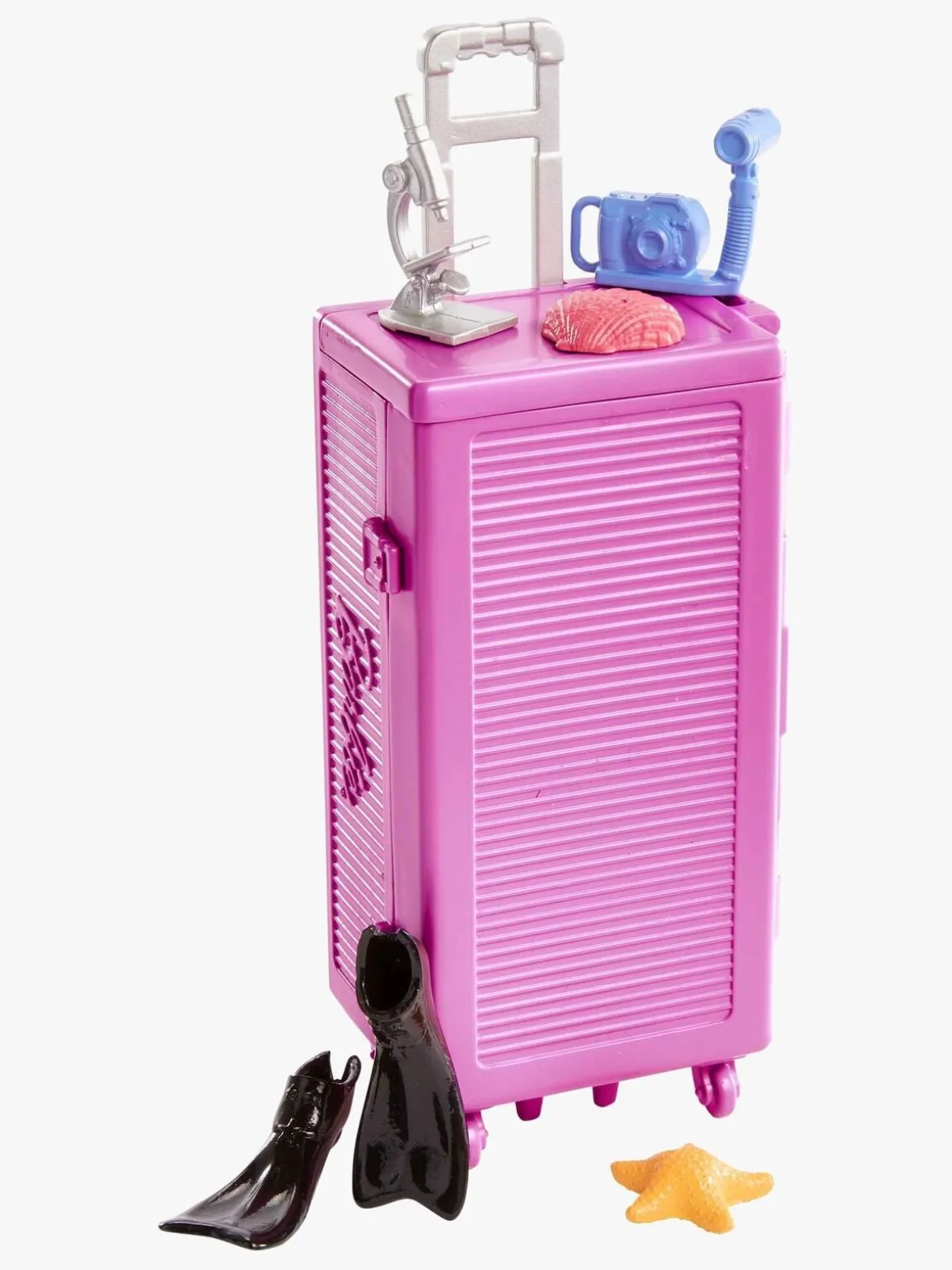 – Indeholder: 1 barbiedukke, 1 mobilt laboratorie, 1 svømmevest, 1 snorkelsæt, 1 delfin, 1 fisk, 1 søstjerne, 1 koral, 1 musling, 1 miniakvarium, 1 net, 1 mikroskop, 1 clipboard, 1 kamera, 1 klistermærkesæt.