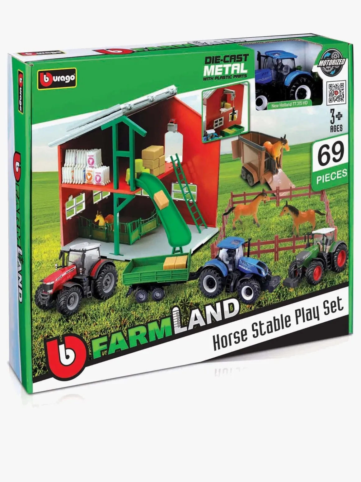 – Indeholder 1 stald, 1 New Holland-traktor, 3 heste, 1 hestetrailer, høtyve og meget andet sjovt tilbehør.