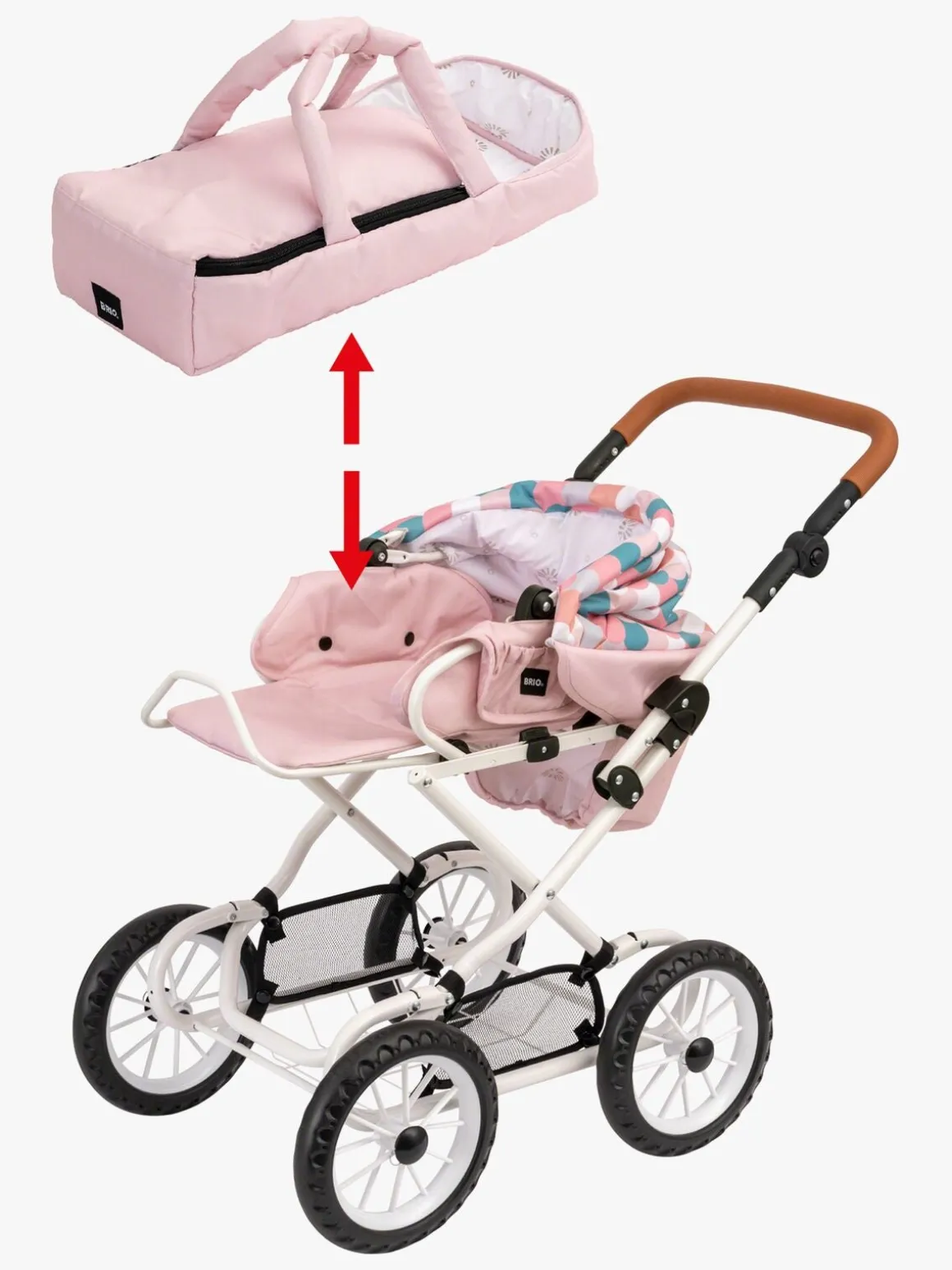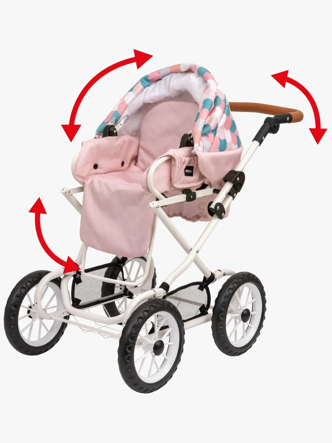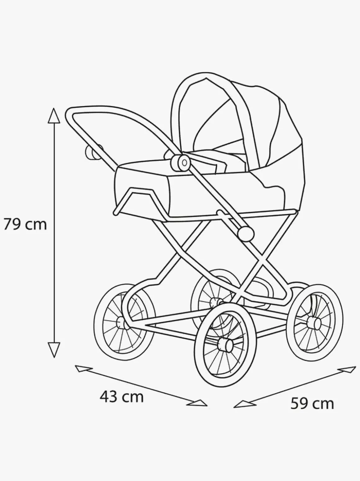 Dukkevognen kan bruges både inde og ude, da den har store gummihjul, der ikke laver mærker på gulvet. Den er lavet af et materiale, der er let at tørre af og dens håndtag kan justeres, så den kan bruges af børn i forskellige aldre.