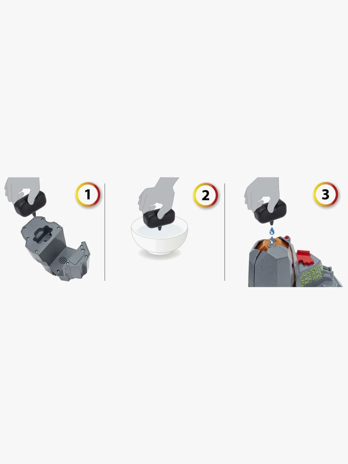 – Tryk på den lille knap på toppen. Dette aktiverer glødende lavalys, vulkanlyde og dampeffekter, der er sikre at røre ved.