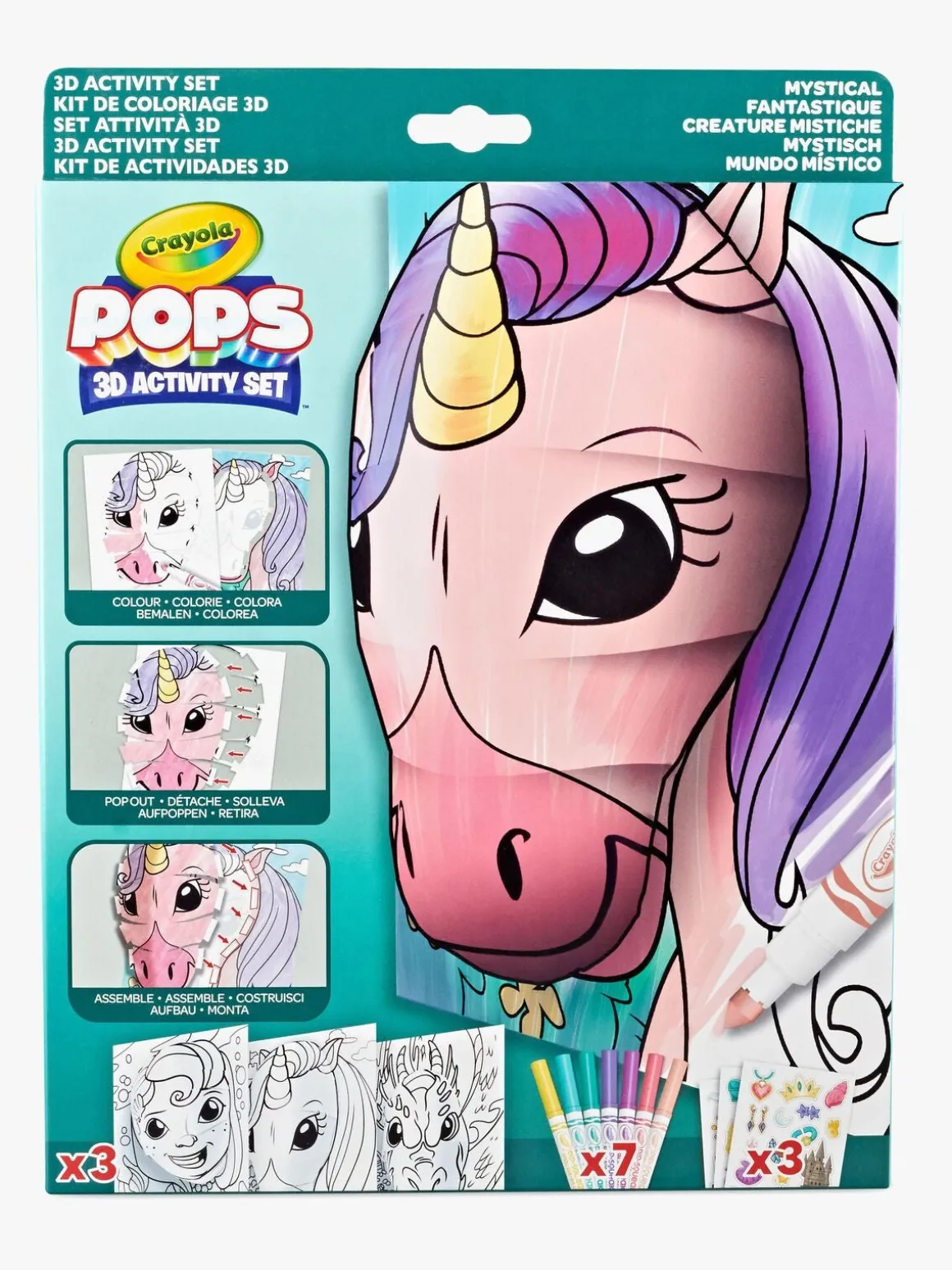 – Sættet indeholder tre POPs 3D-farvelægningsark, tre baggrundsark, en taperulle, tre klistermærkeark og syv tusser.