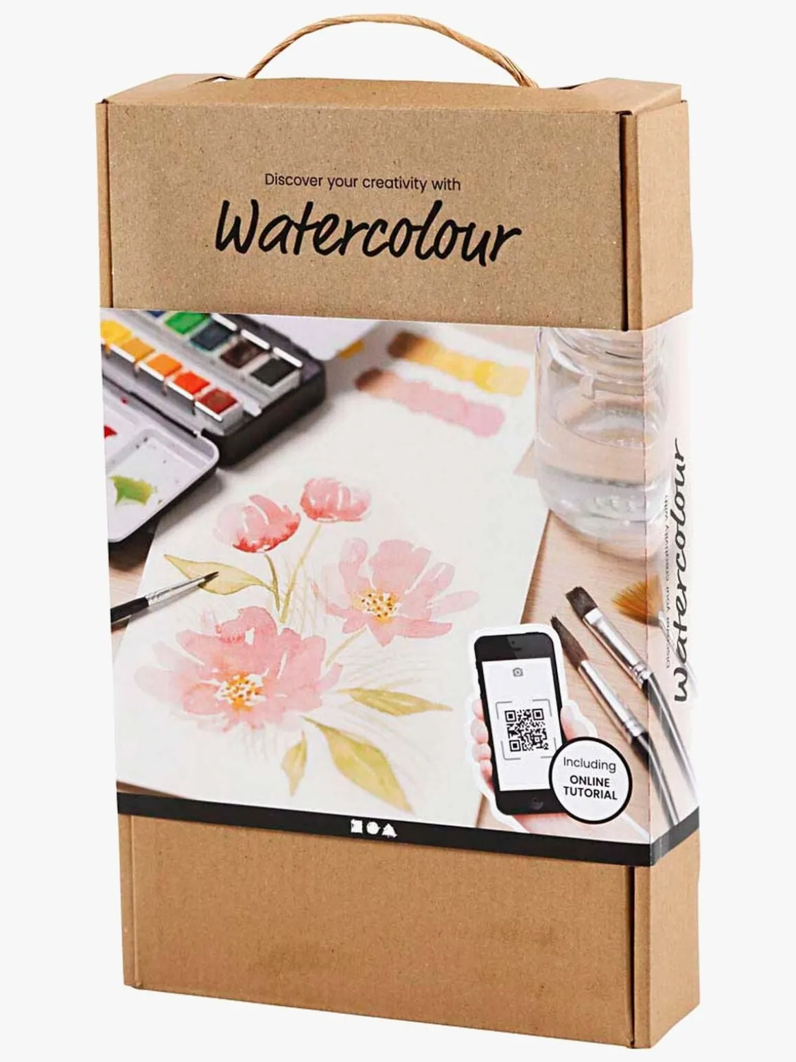 I pakken, er der også en QR-kode, som ved scanning fører dig videre til en detaljeret instruktionsvideo, der introducerer flere forskellige akvarelmalingsteknikker. Det perfekte sæt til nybegynderen!