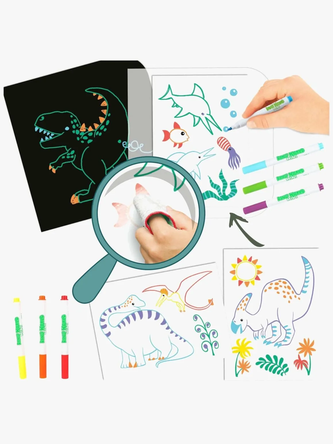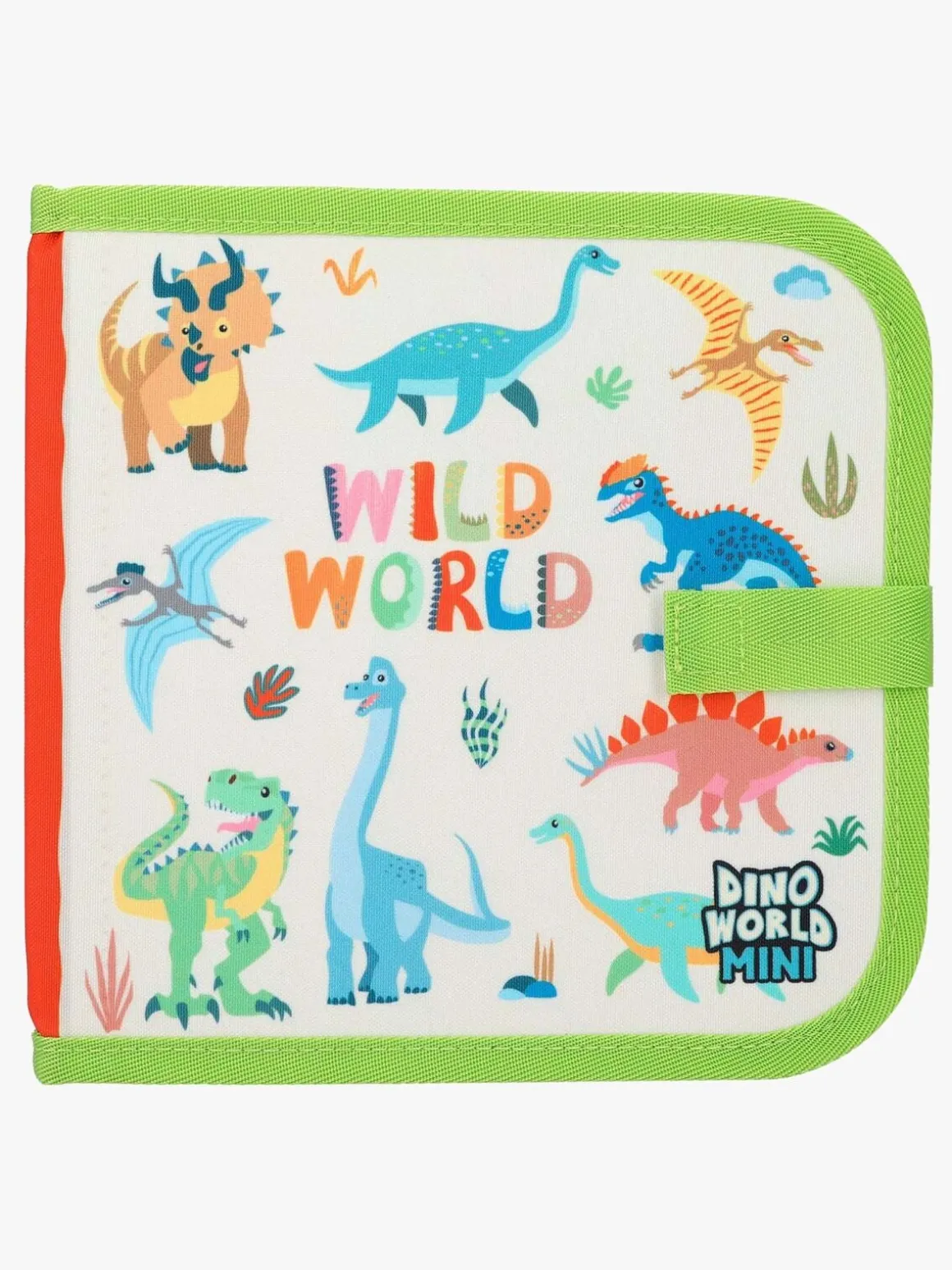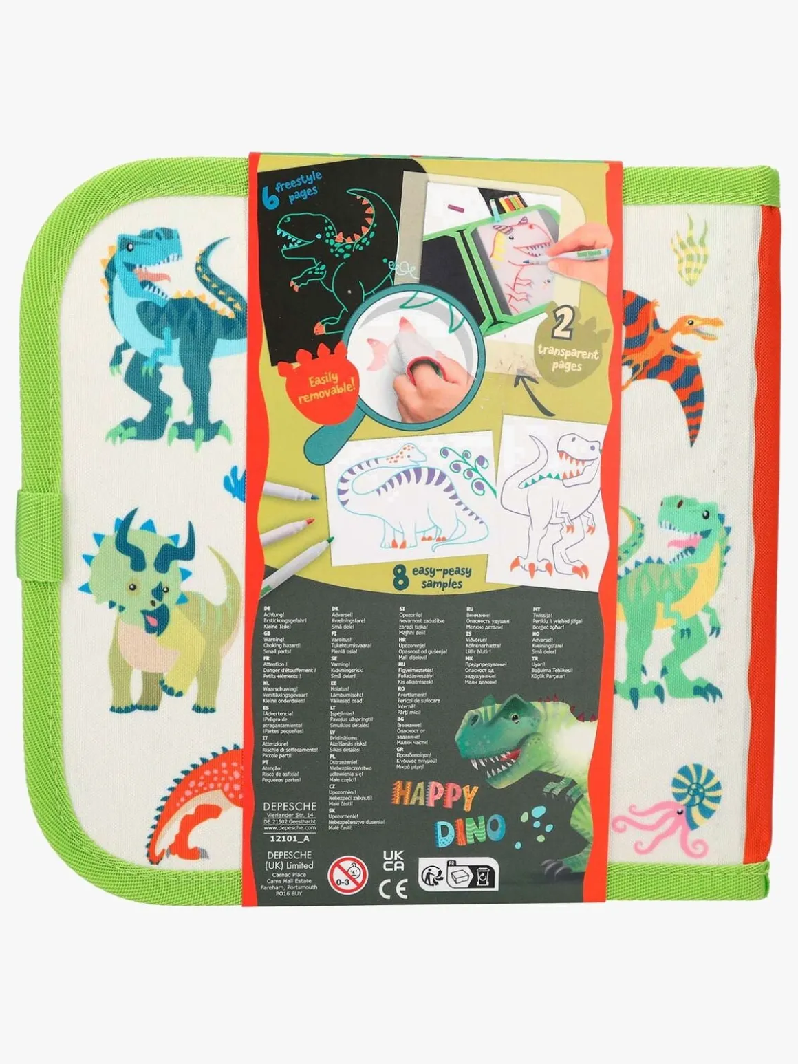 Malebog fra DinoWorld med en indsyet pose. Den har 6 farveblyanter og sorte sider. Malebogen har en transparent side, hvor du kan følge linjerne på de søde skabeloner. Når du er færdig med at tegne, kan du bare tørre af med et stykke fugtigt køkkenrulle og begynde forfra.