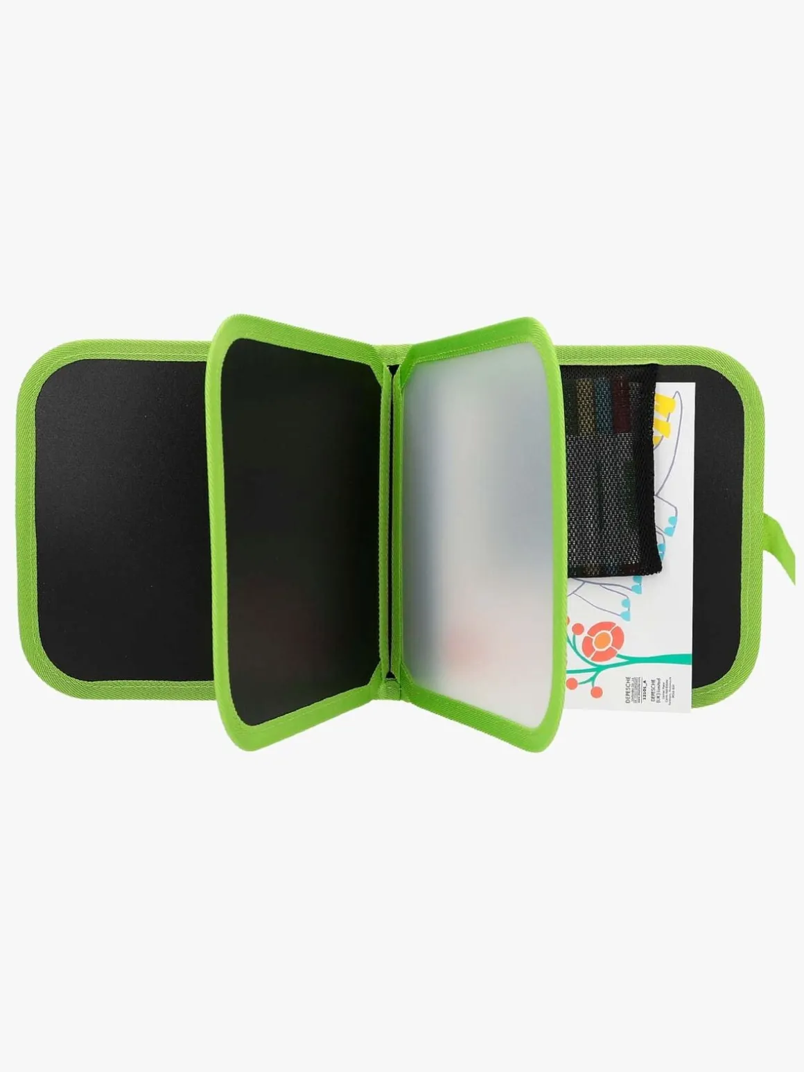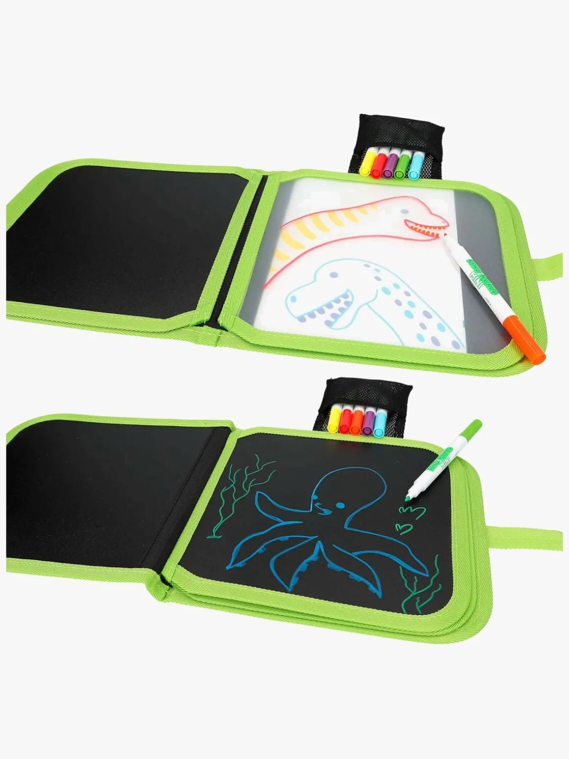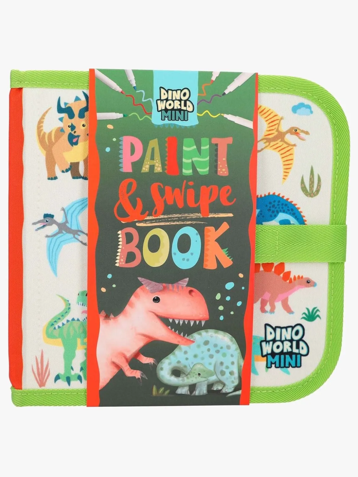 Malebog fra DinoWorld med en indsyet pose. Den har 6 farveblyanter og sorte sider. Malebogen har en transparent side, hvor du kan følge linjerne på de søde skabeloner. Når du er færdig med at tegne, kan du bare tørre af med et stykke fugtigt køkkenrulle og begynde forfra.