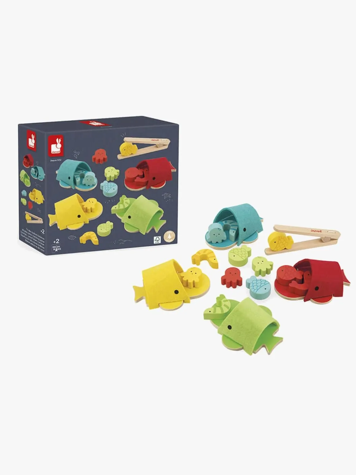 – Fang de små havdyr ved hjælp af trætængerne og placér dem i munden på hvalen med den modsvarende farve.