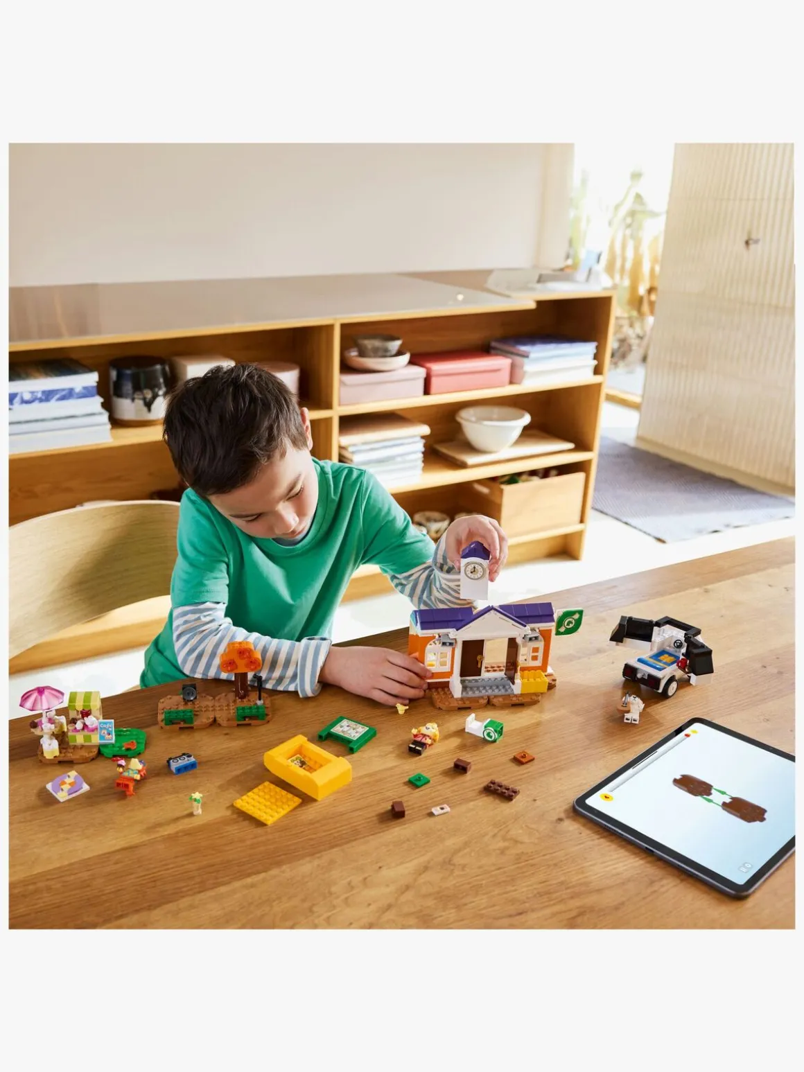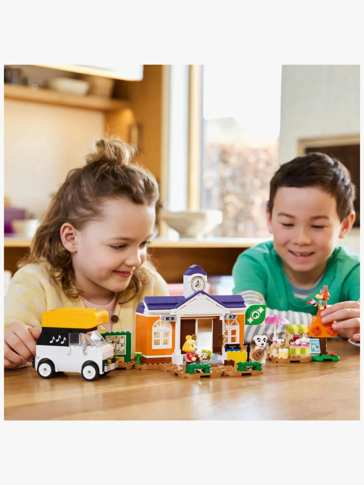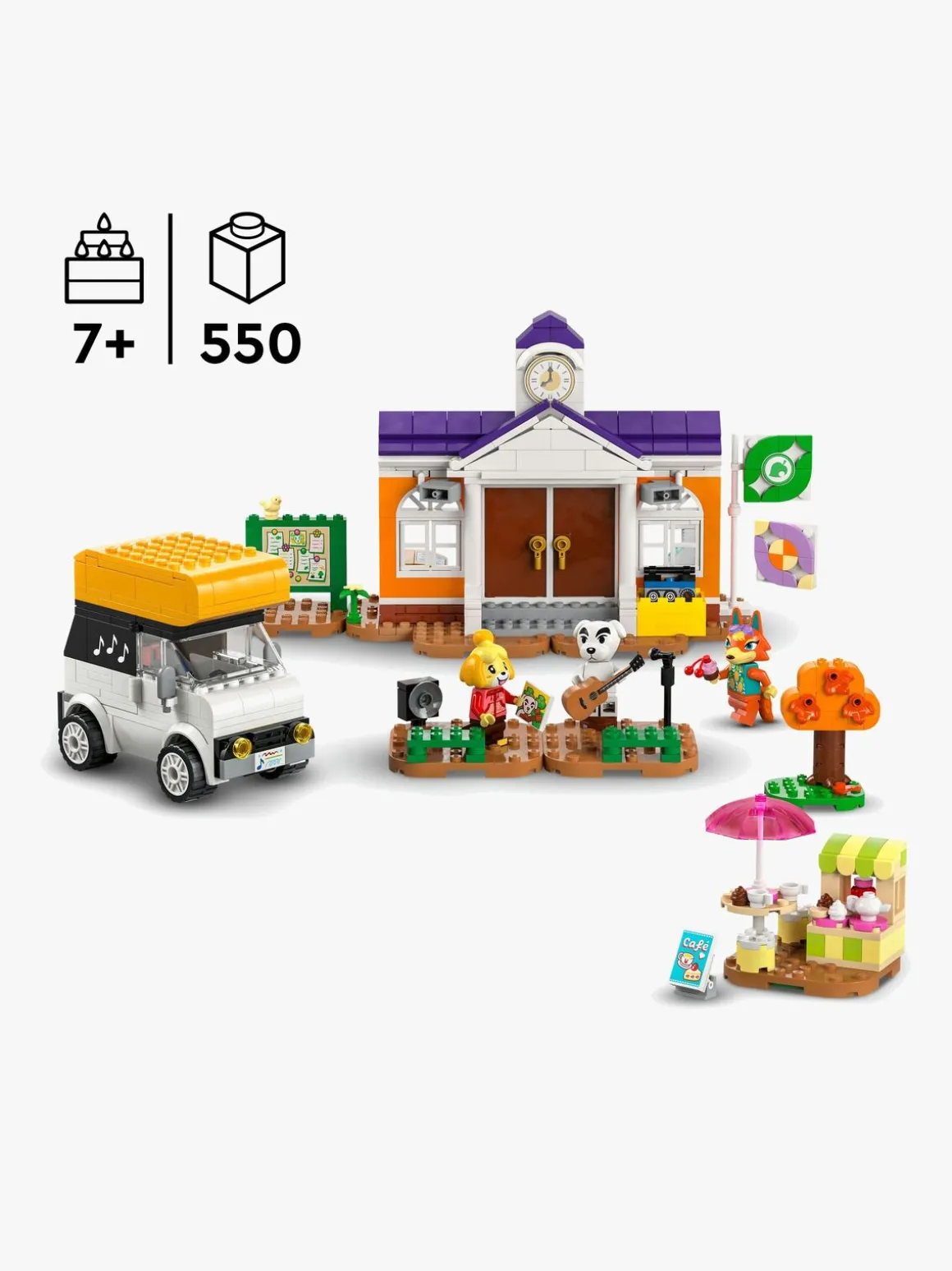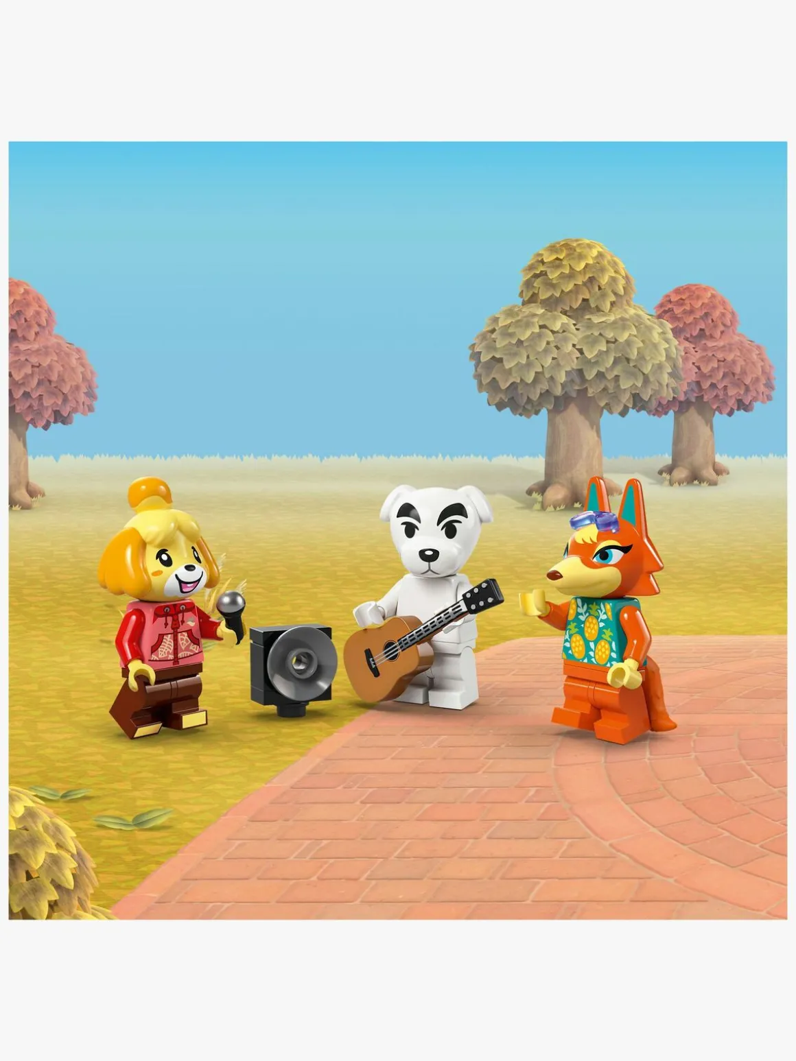Børn kan gøre klar til K.K.’s koncert ved at hente hans legetøjsmikrofon fra autocamperens tag, og de kan lege, at de spiller på legetøjsguitaren eller strækker ud sammen med Isabelles gruppe. De kan få de seneste nyheder på caféen med Audie, inden de ordner hendes ting inde på rådhuset, hvor de kan få et DIY-opskriftskort, indløse belønninger i hæveautomaten og tjekke genbrugsboksen for nye ting. Ligesom i videospillet skjuler træet en overraskelse, og servicecenterets flag kan tilpasses. Børn kan også omarrangere byggeplader for at give deres LEGO Animal Crossing sæt et nyt look.