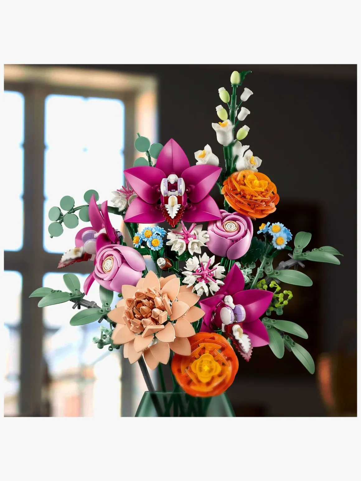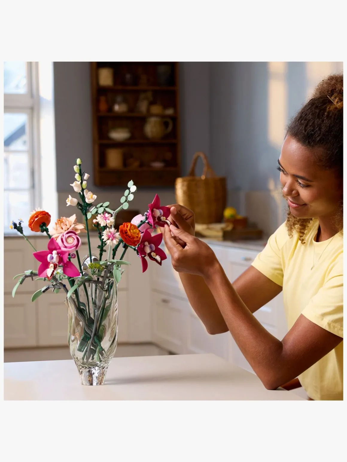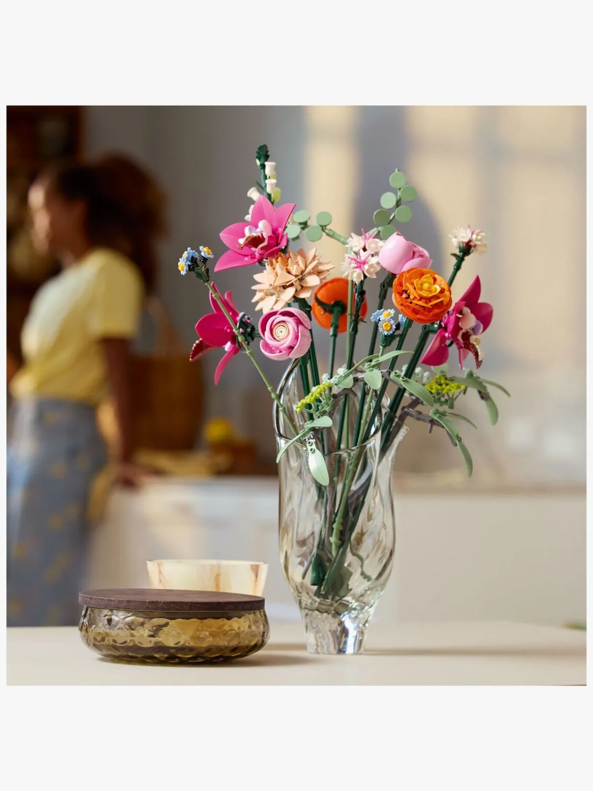 Spirende blomsterhandlere kan fordybe sig og slappe af, mens de bygger buketten, som består af 15 stilke med LEGO blomster, bl.a. tusindfryd/margueritter, kornblomster, eukalyptus, hyldeblomster, roser, ranunkler, bådorkidéer, en åkande-dahlia og en klokkeblomst. Alle stilke er justerbare, så byggere har mulighed for at arrangere en helt særlig buket, som de kan bruge som blomsterdekoration i hjemmet eller på kontoret. Blomsterne kan desuden arrangeres med andre LEGO buketter sælges separat for at skabe en større og endnu mere unik blomsterudstilling.