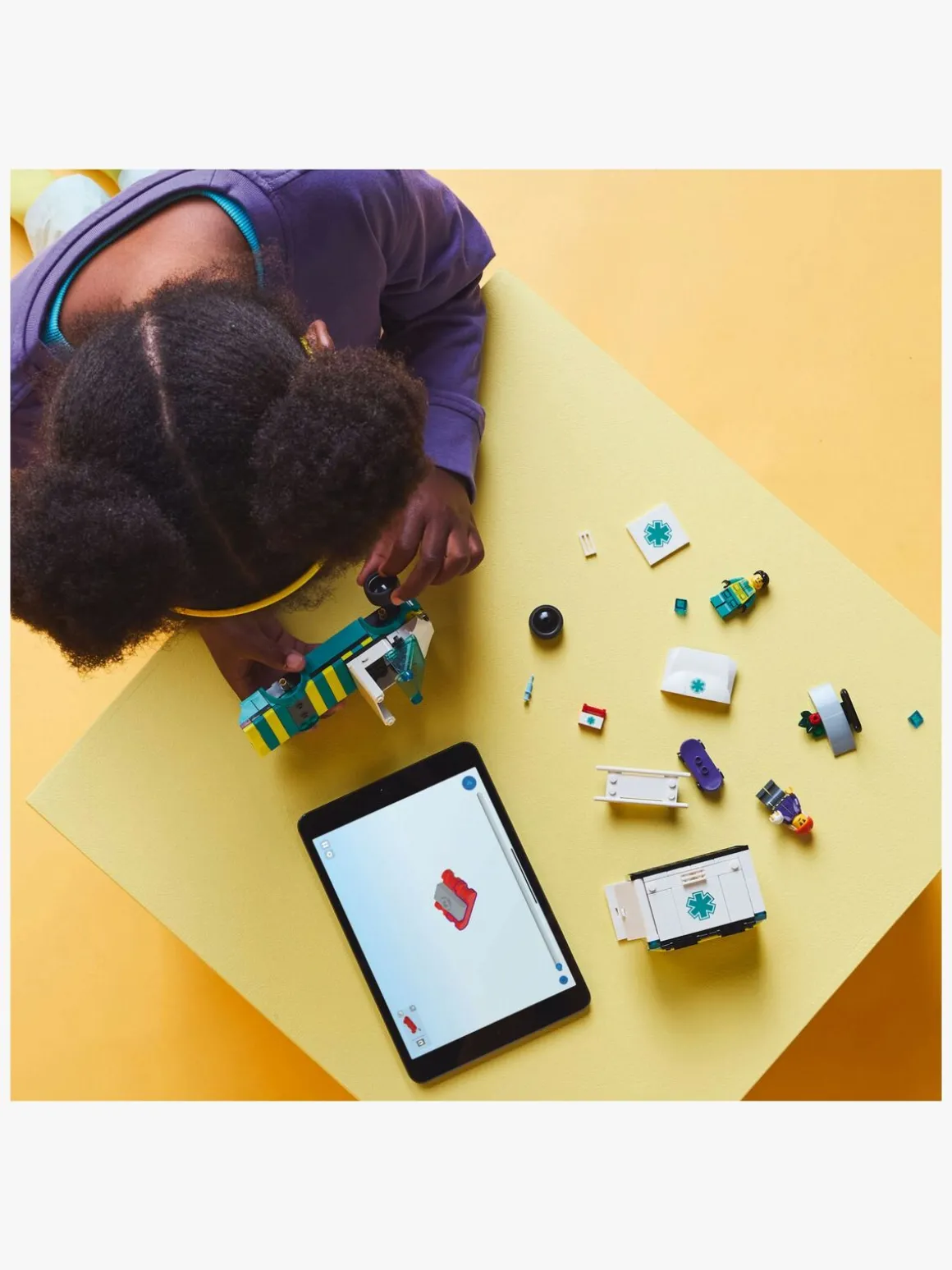 Byggesættet med en ambulance indeholder trykt trinvis byggevejledning, og der er 3D-vejledning i LEGO Builder appen. Her kan børn udforske og gemme legesæt, holde styr på, hvor langt de er kommet i byggeprocessen, samt zoome ind på, dreje og se modeller fra alle vinkler, mens de bygger.