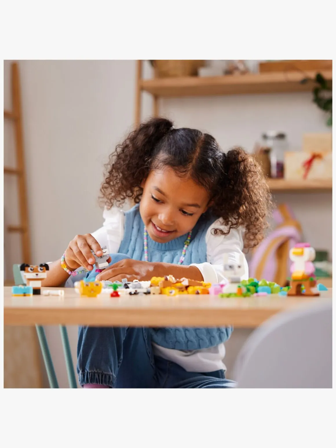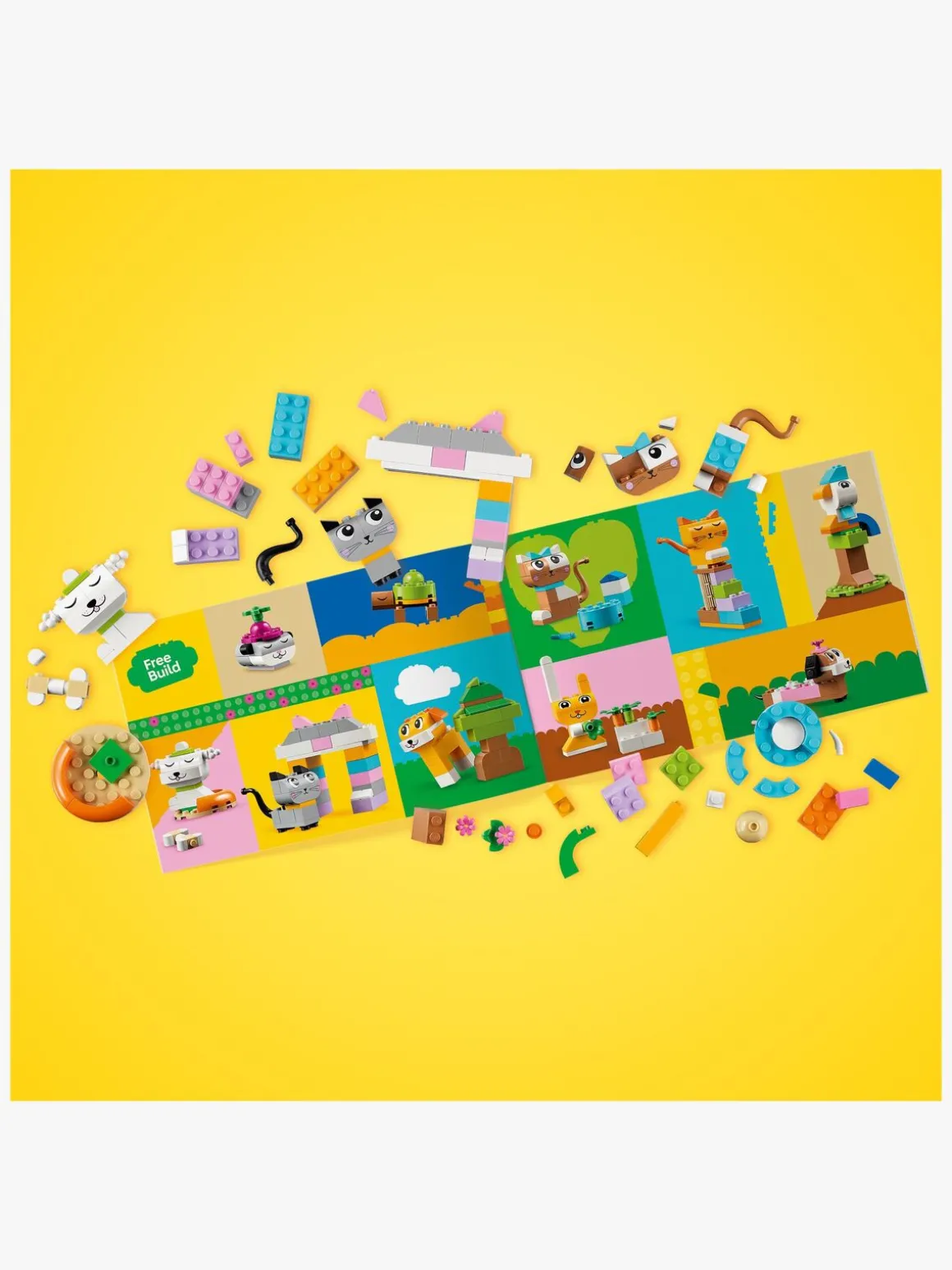 Med 450 LEGO byggeklodser, bl.a. specialelementer med øjne og mund, og nemme trinvise vejledninger kan børn bygge en hund med skål og ben, en kat på en søjle, en hamster med et æble, en kanin med en gulerod og en fugl på en pind. Med de medfølgende forslag til alternative farver, former og funktioner kan børn ombygge deres kæledyr på en sjov og ny måde. I takt med at deres kreative byggefærdigheder udvikler sig, kan børn afprøve deres egne idéer. Der medfølger en guide med 10 idéer, der kan kickstarte sjov fribyggeri.