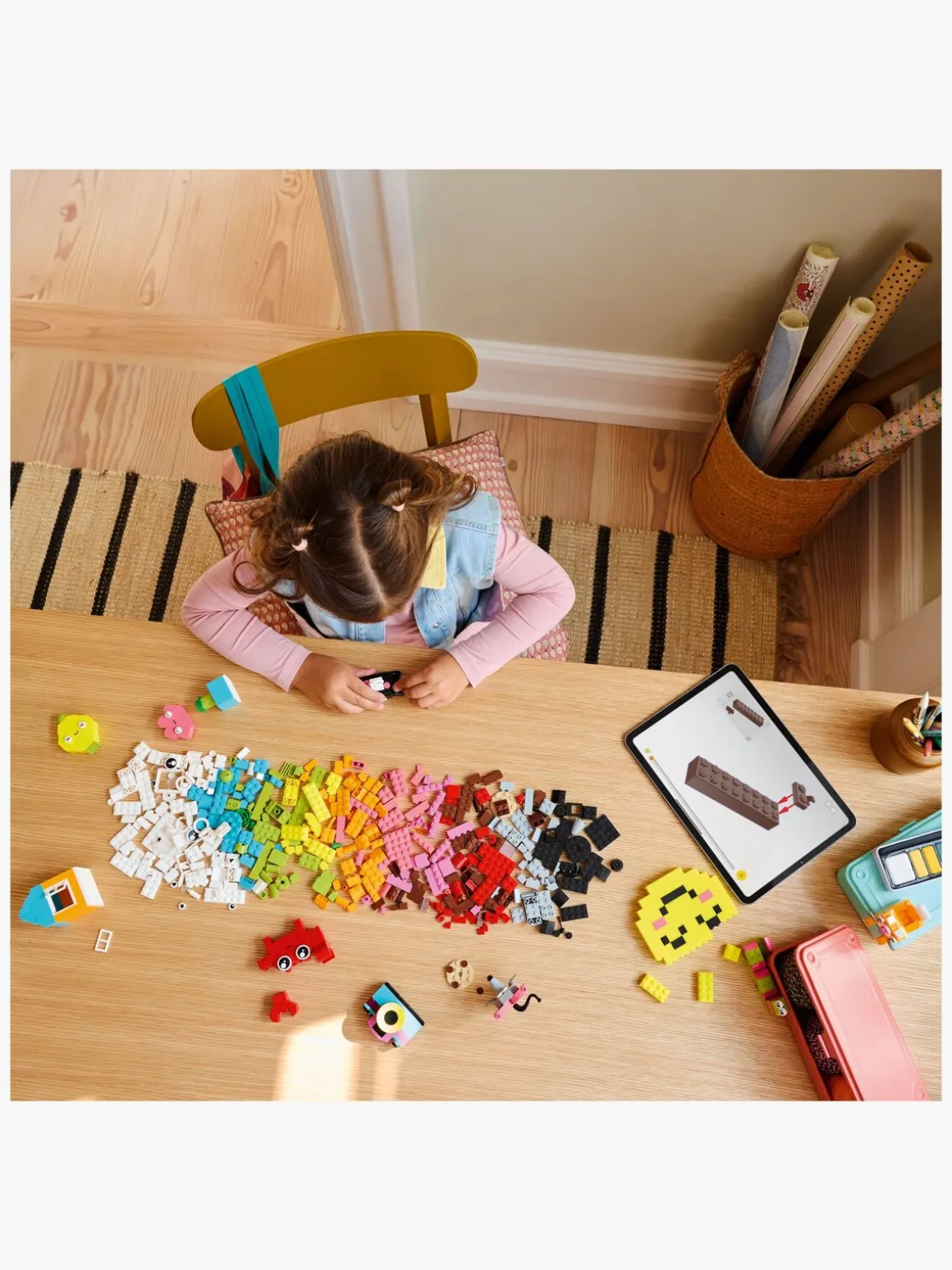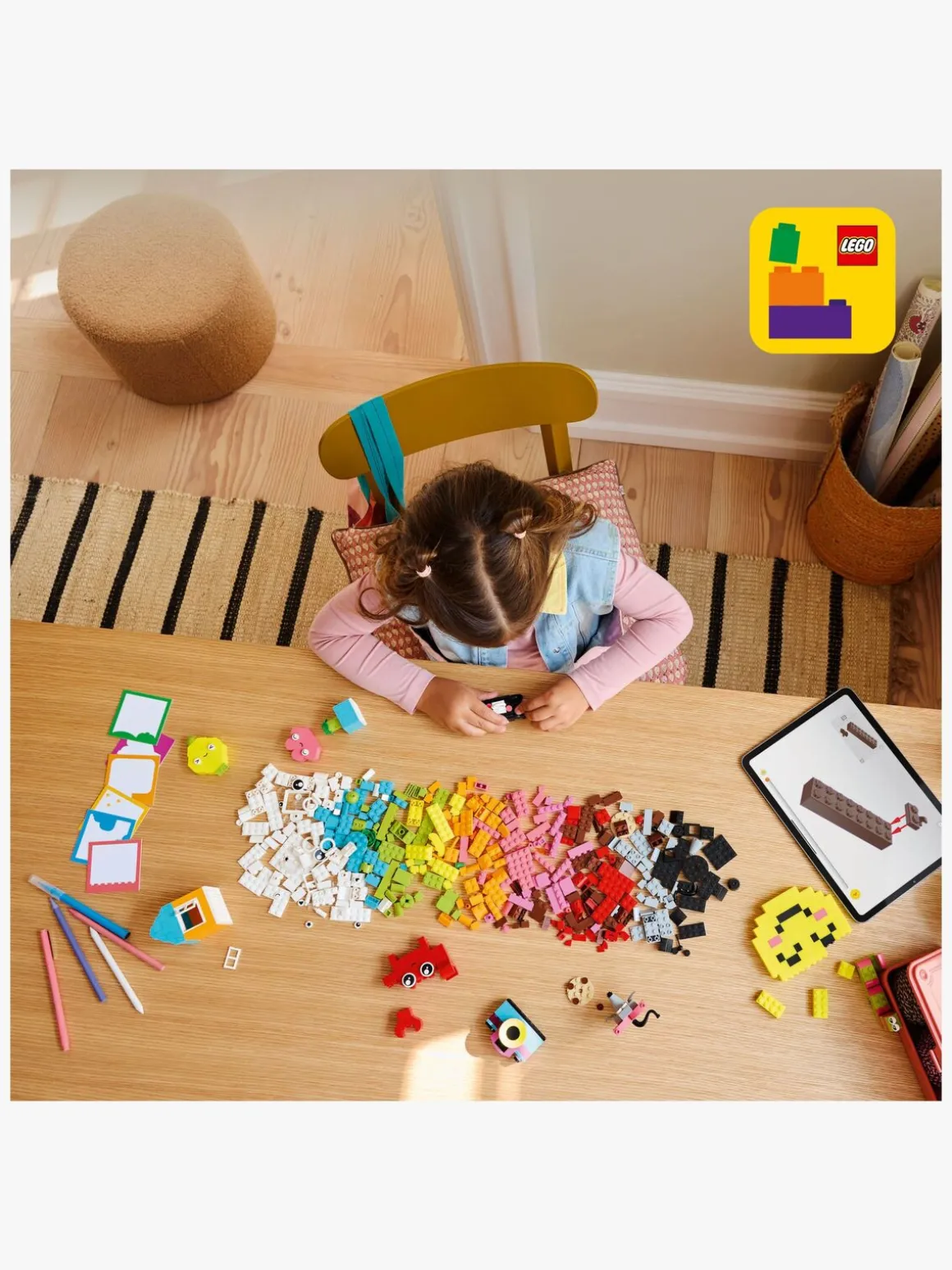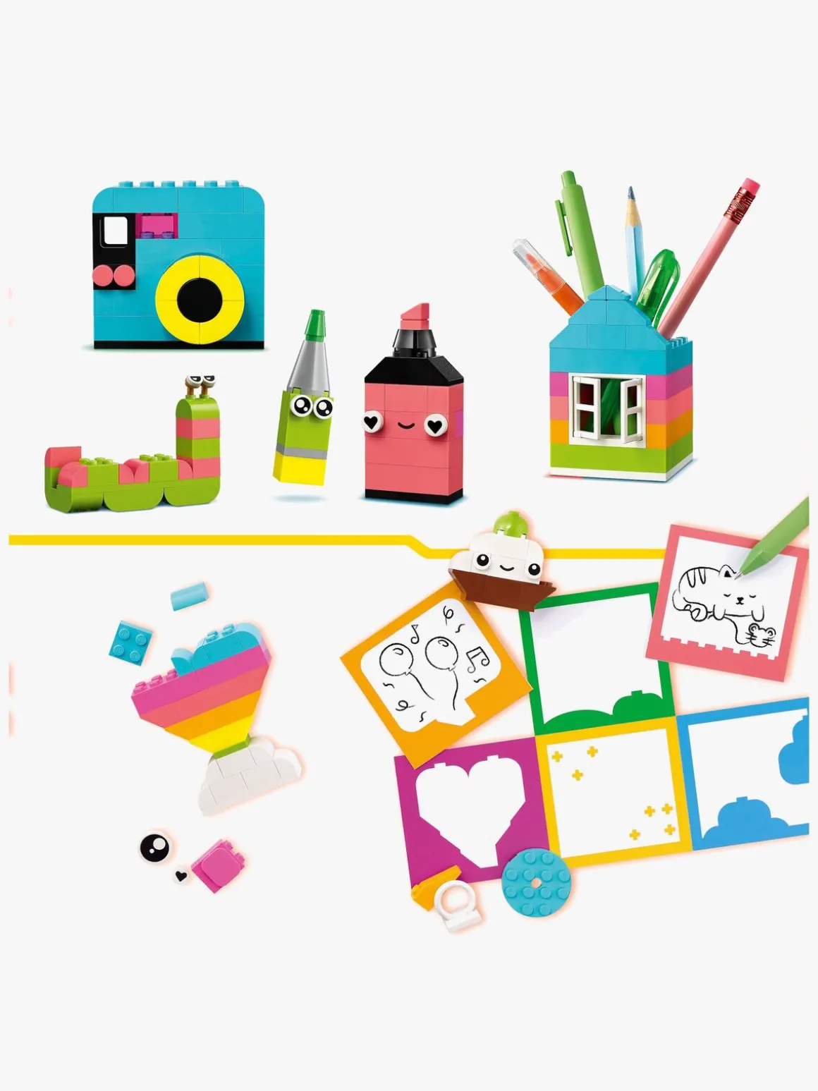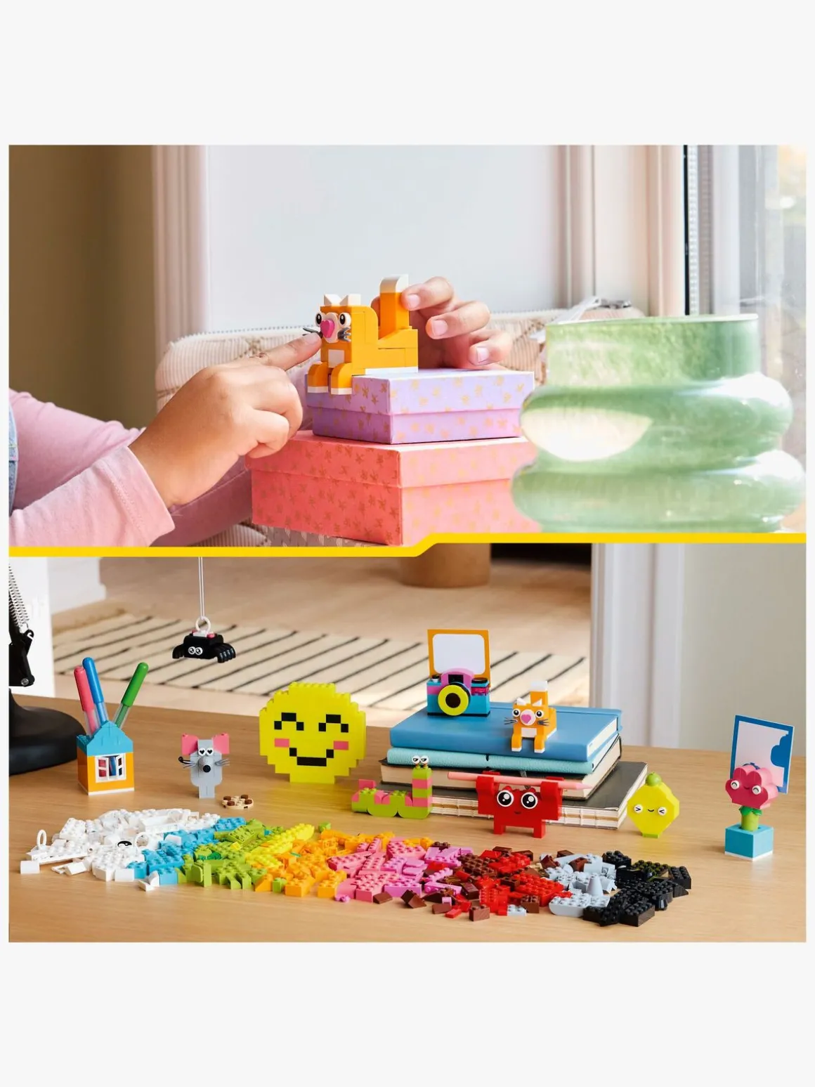 Den kreative glade æske indeholder forslag til 10 modeller, der er hurtige at bygge, og som hver især er designet som inspiration til glæde. Børn kan ombygge modellerne til 12 nye modeller og derefter tilpasse dem videre til deres egne uendelige kreationer – så de kan udsmykke værelset med sjove og funktionelle ting, de selv har bygget. Edderkoppen, bien og fuglen har ophængningselementer til udstilling. Krabben, aben og huset kan rumme små genstande, såsom blyant eller tandbørste. Blomsten, kameraet, overstregningstuschen, hjertet og kaktussen har et clips-element, så børn kan fastgøre en note, et kort eller et billede farvet papir medfølger i sættet. Andre modeller omfatter en kat, mus, citron, orm og smiley. Spred lidt glæde med en sjov og praktisk måde at inspirere børns kreativitet på.