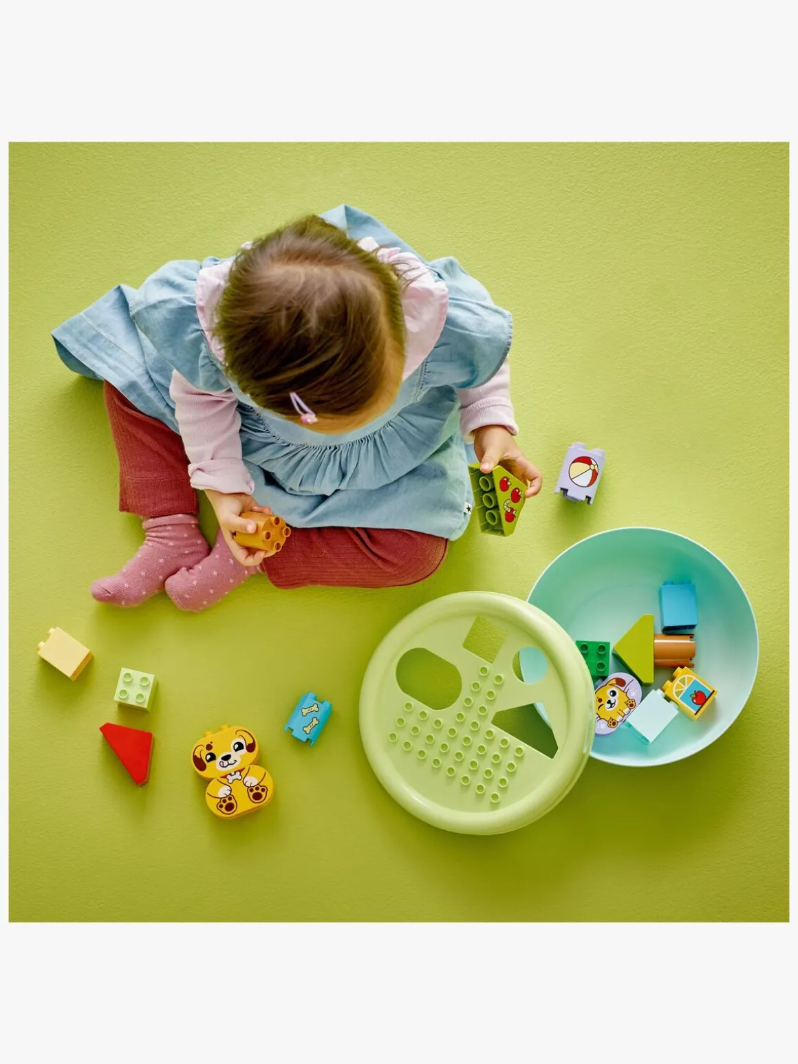En legetøjsgave til tumlinger, der styrker den rumlige orienteringsevne og er fyldt med sjove læringsaktiviteter for familien. Forældre kan udpege formerne i sættet, mens de små bruger dem til at bygge træer, hundefigurer og et hus. Derefter kan de nyde kreativ rolleleg med deres søde LEGO DUPLO legetøjshunde, trille en bold til dem og give dem et kødben.