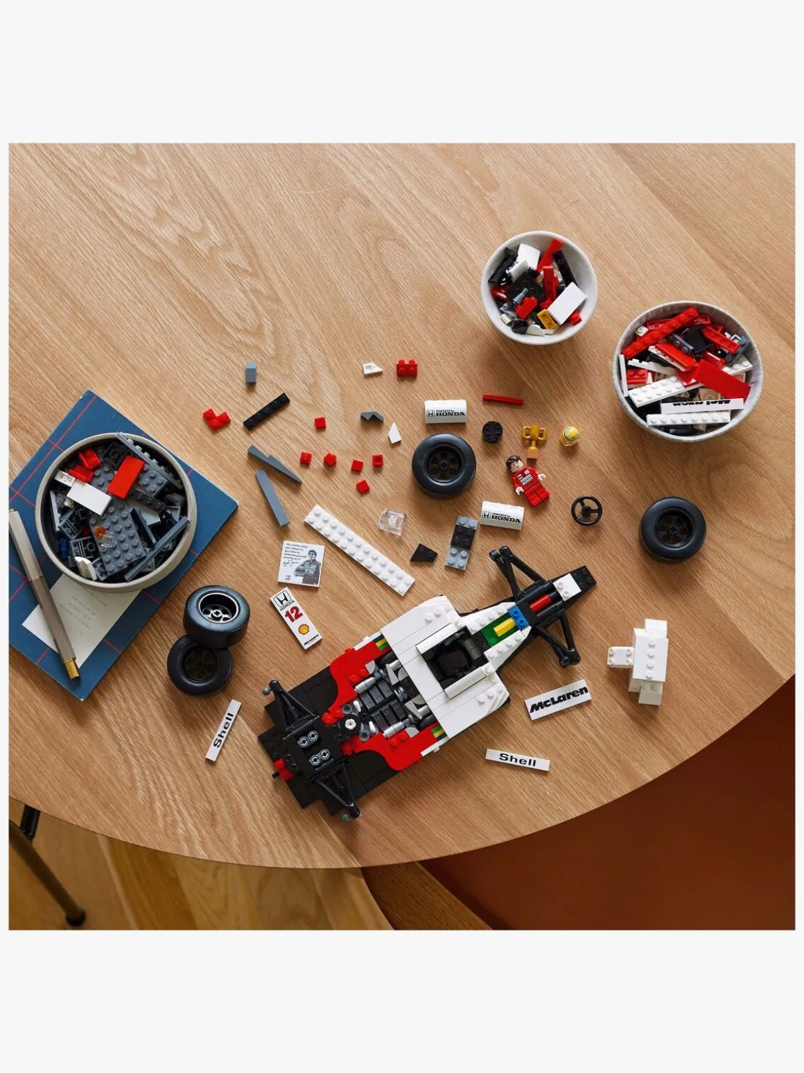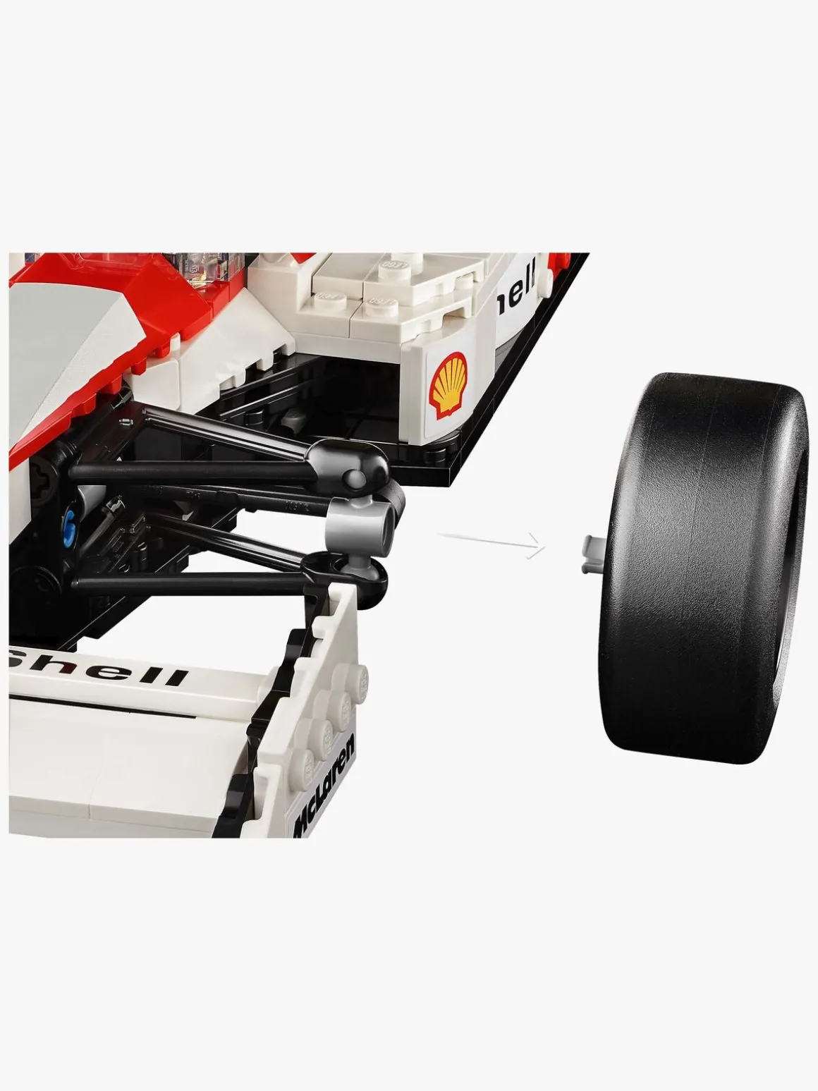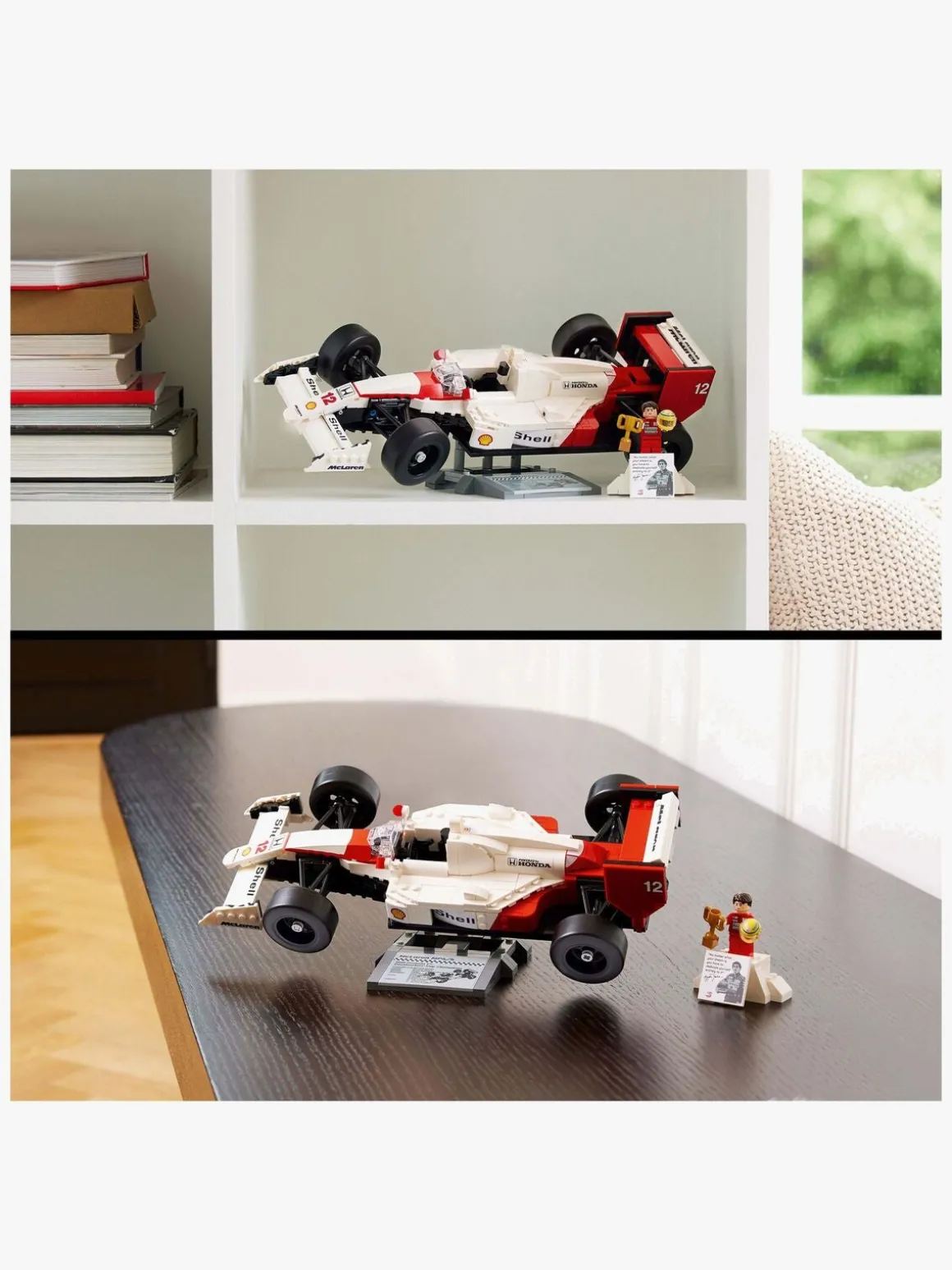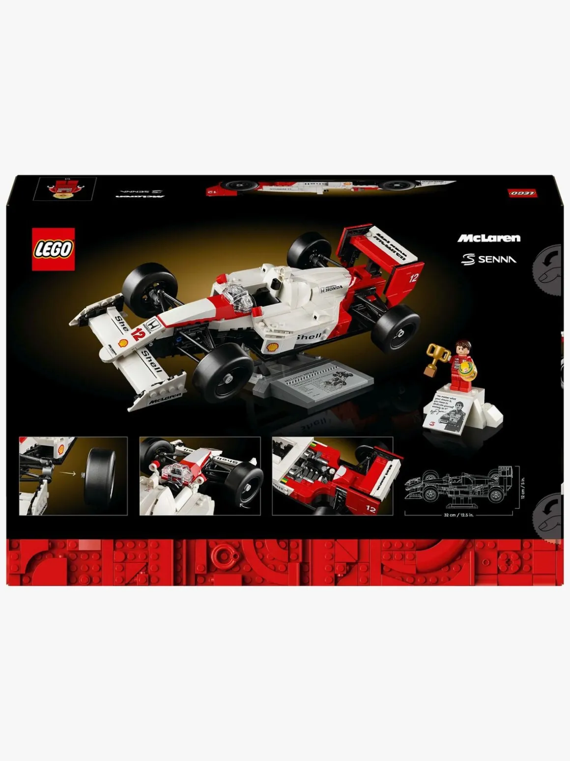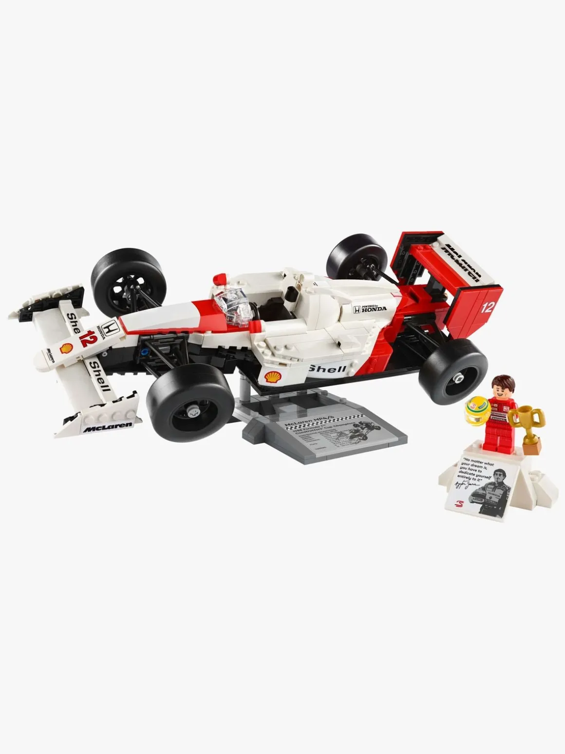 McLaren MP4/4-kopien har fungerende styring, stangfjedring, en justerbar bagvinge, slick-dæk, spejle, et gearskift og en detaljeret turboladet V6-motor samt en udstillingsstand og en faktaplade med interessant statistik. Minifiguren af Ayrton Senna har en udstillingsstand i form af et podie og en faktaplade med et ikonisk citat og foto af Ayrton Senna.