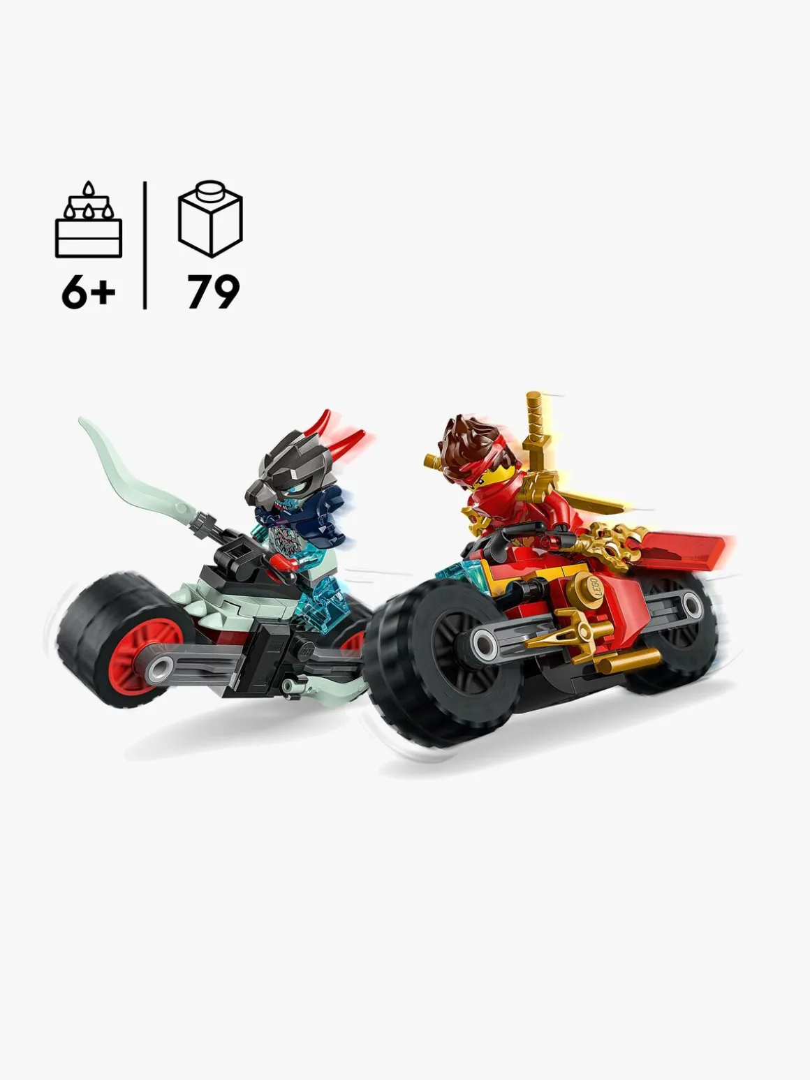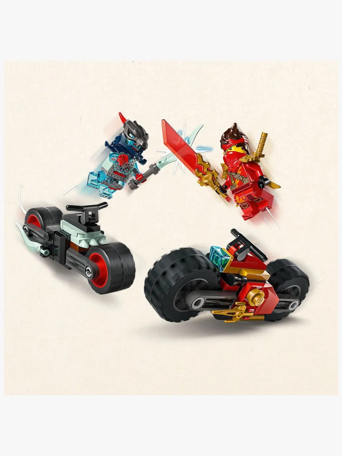 Ninja-køretøjssættet indeholder 2 NINJAGO-minifigurer, der kan køre på motorcyklerne: Kai bevæbnet med en gennemsigtig klarsyns-klinge og 2 gyldne katana-sværd samt en dragonisk ånde-spejder med et sværd som tilbehør, så børn kan nyde fantasifuld leg alene eller sammen med venner, når de udspiller kampe mellem det gode og det onde.