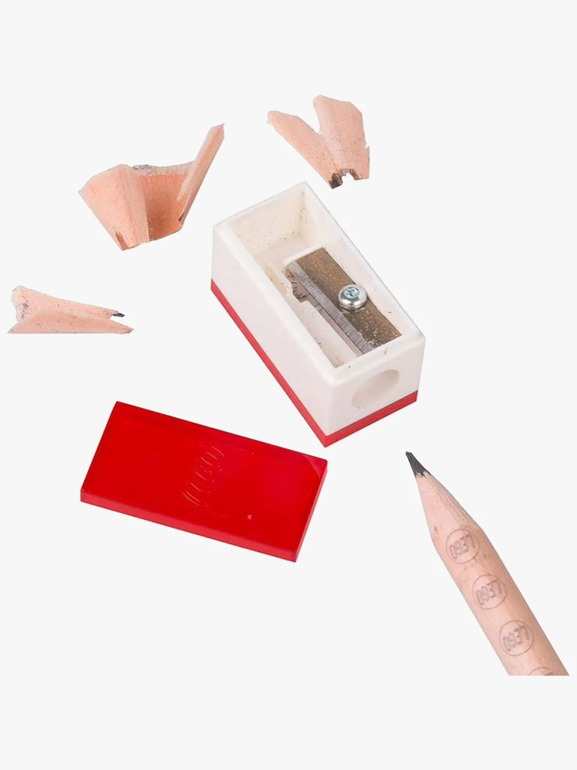 – Indeholder: Fire grafitblyanter, blyantspynt, et viskelæder, en blyantsspidser og en LEGO-minifigur.