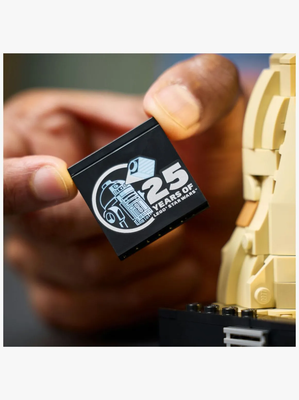 Den imponerende bygge- og udstillingsmodel omfatter en plade med Qui-Gon Jinns råd “Remember. Concentrate on the moment. Feel. Don’t think. Trust your instincts.” og en LEGO Star Wars 25-års jubilæumsklods.
