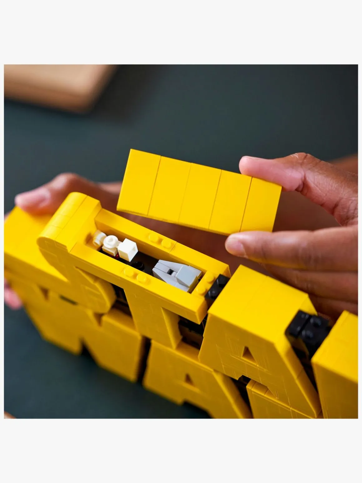 Tag dig tid, og giv efter for din passion, mens du fordyber dig i et sjovt og berigende kreativt projekt. Indfang de glatte konturer af de gule bogstaver, og indbyg klassiske LEGO greebling-detaljer i de sorte mellemrum mellem bogstaverne. Se også efter en herlig overraskelse gemt inde i T’et i Star Wars.