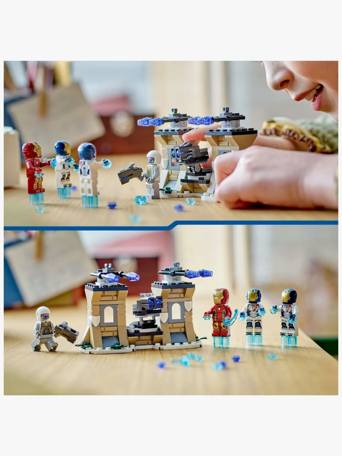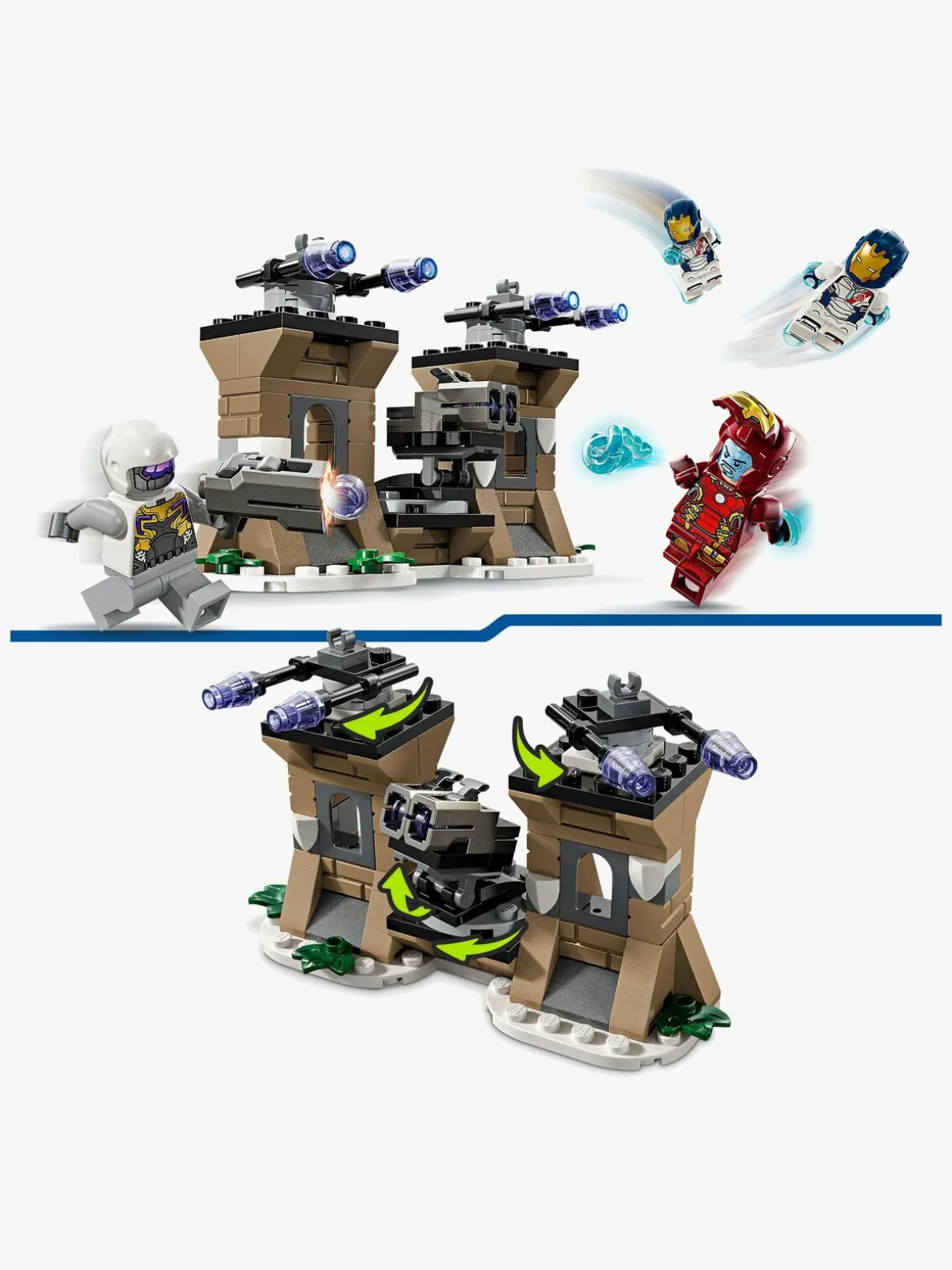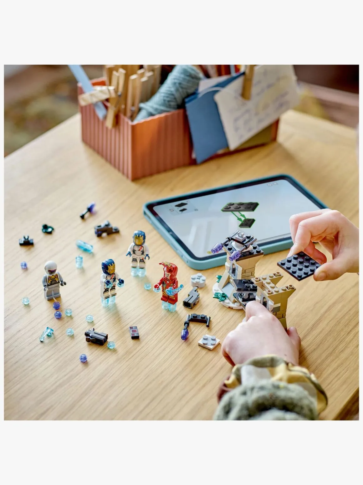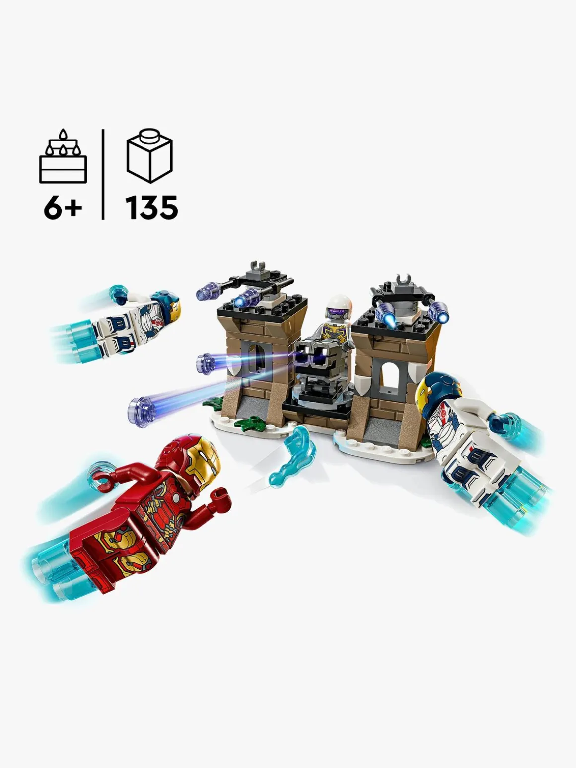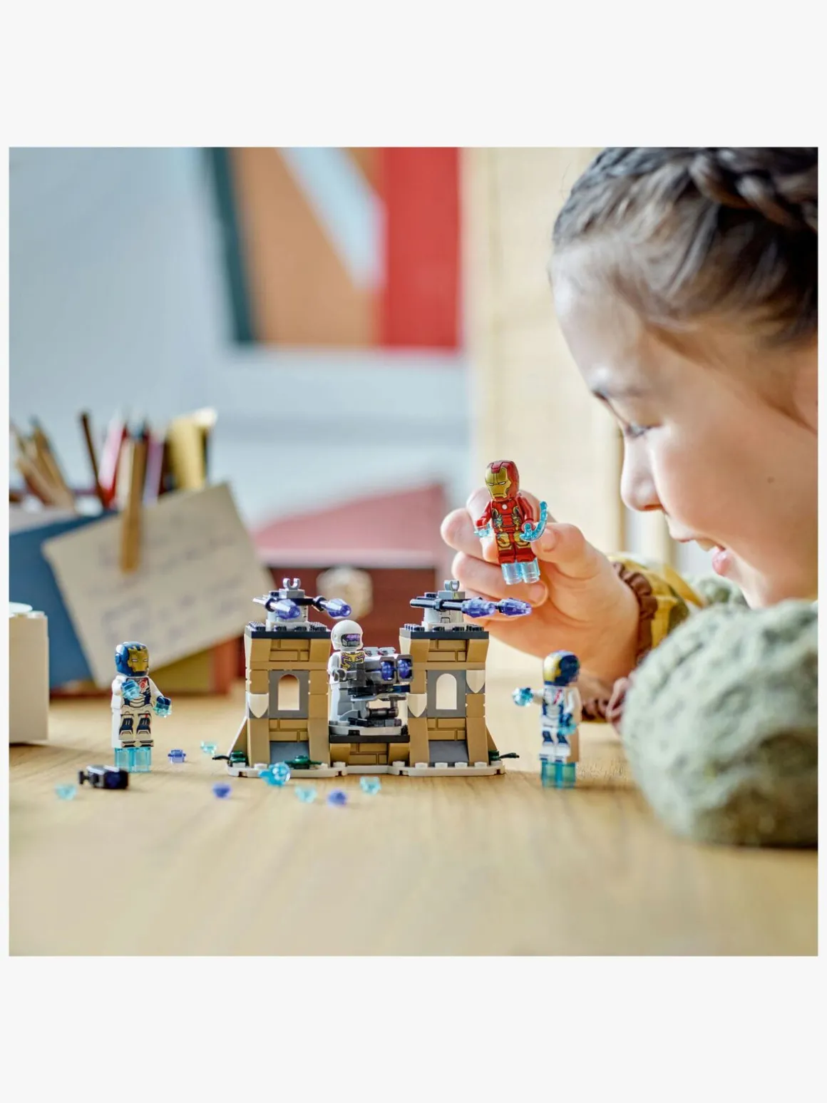 Byg-selv-sættet indeholder 4 minifigurer: Iron Man, 2 Iron Legion-robotter og en Hydra-soldat. Iron Man har et visir, der kan åbnes, og holder en powerblaster. Hydra-soldaten har en knopskyder. Legetøjssættet omfatter gennemsigtige blå klodser, som kan give indtryk af, at minifigurerne flyver. Hydra-basen har 2 knopskydere fastgjort til et drejeligt gulv, så børn kan få Hydra-soldaten til at skyde efter de angribende superhelte. Øverst på basens tårne sidder 2 par missilkastere kan ikke affyres til at afværge angreb. Der er adgang til ekstra digitale funktioner via LEGO Builder appen.