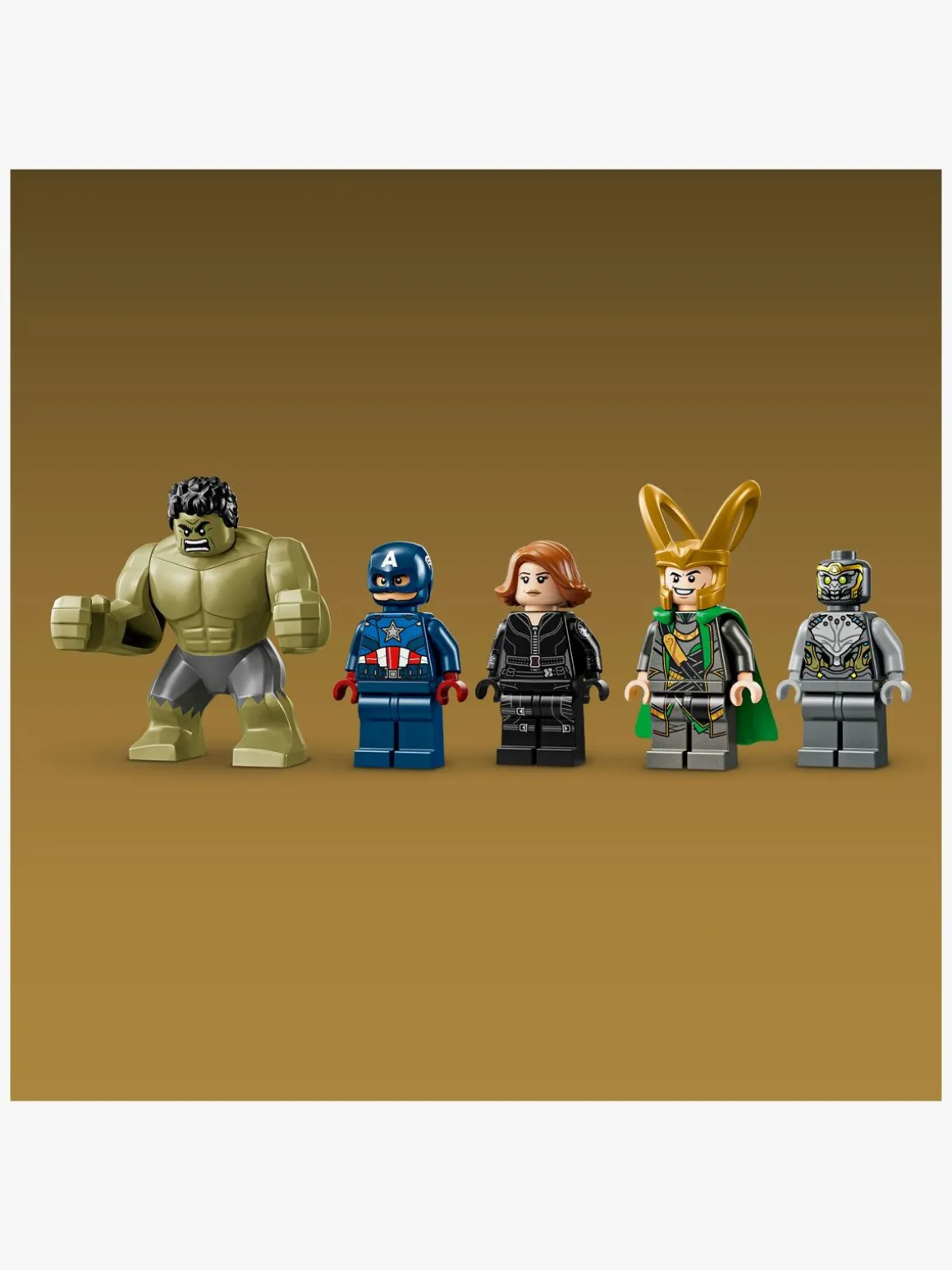 — Minifigurer af Captain America, Black Widow, Loke og en chitauri samt en stor figur af Hulk