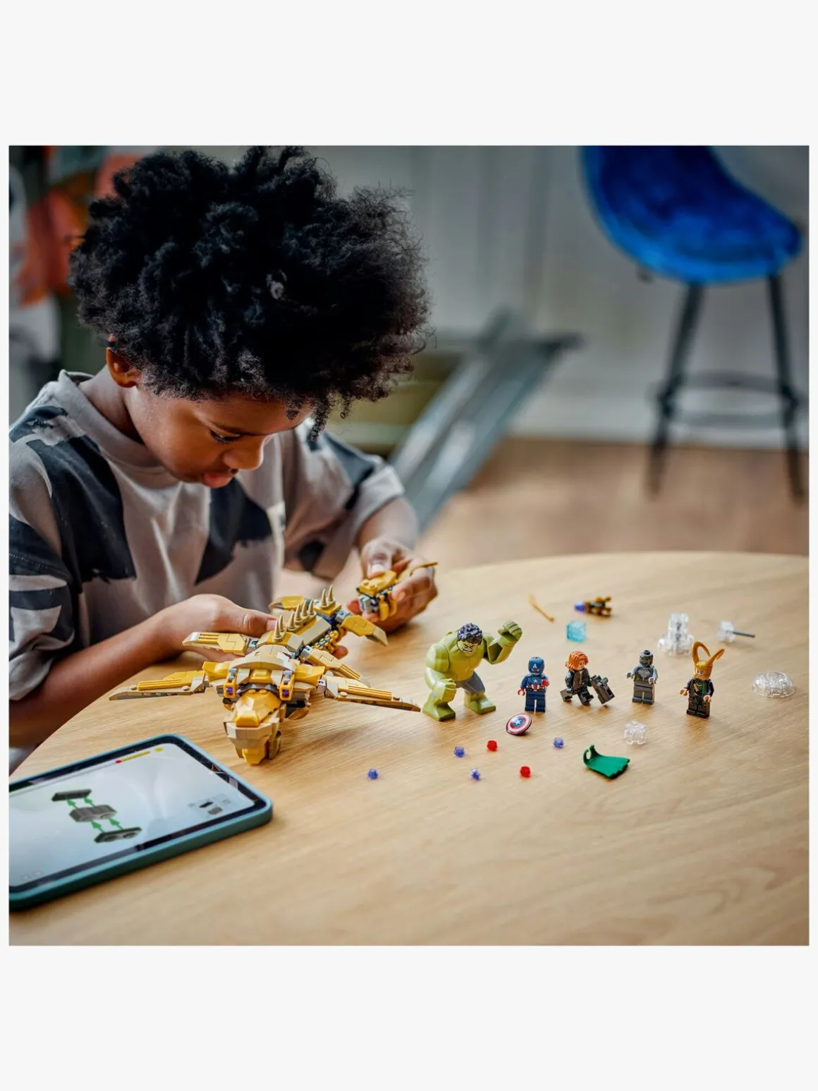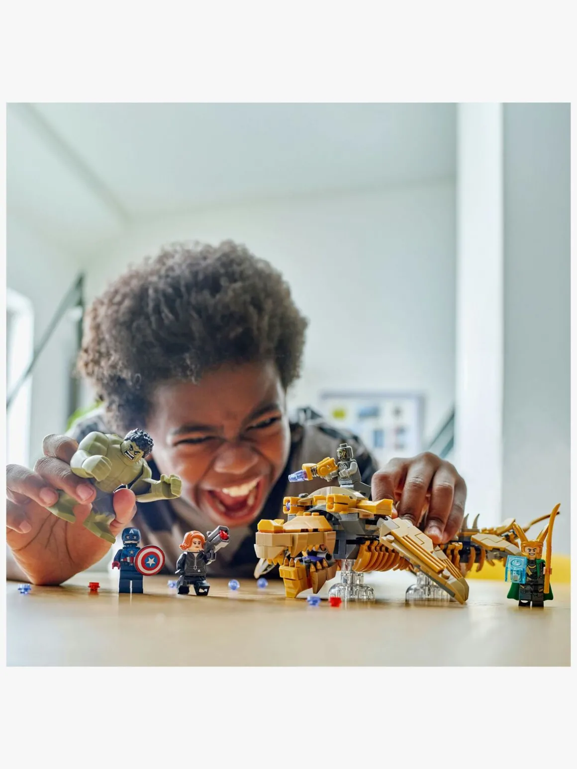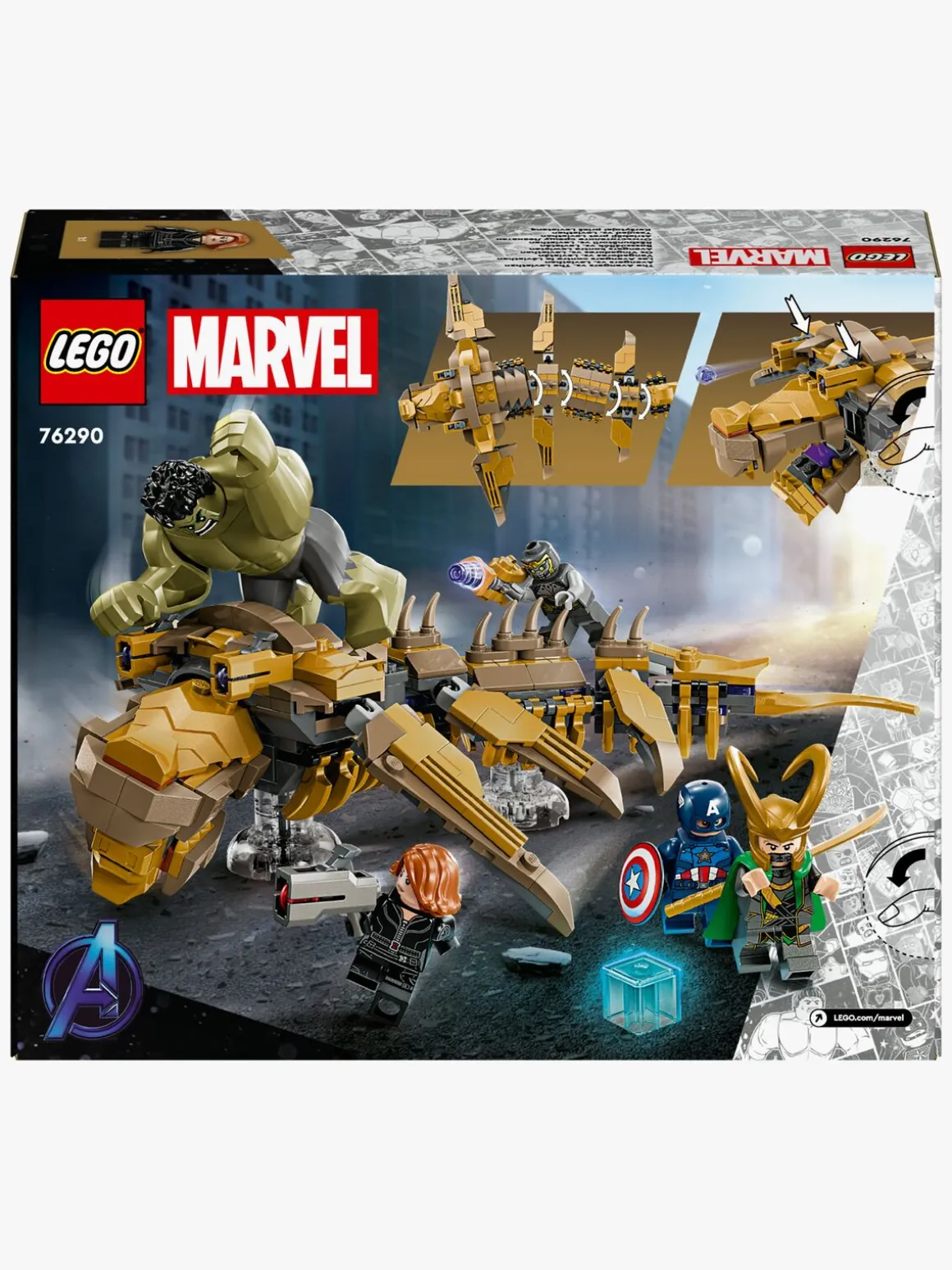 Byggesættet indeholder 4 minifigurer – Captain America med sit skjold, Black Widow med en knopskyder, Loke med sin kappe og hjelm og en chitauri-kriger med en laserpistol – samt en stor figur af Hulk. Leviathan-“lufthvalen”, der kan bygges, har 6 bevægelige finner, en mund, der kan åbnes, et hoved, der kan drejes lidt til siden, og 2 knopskydere. Den har også gennemsigtige holdere, så minifigurerne kan “flyve” under legen, og så hele udstillingsmodellen bliver endnu mere imponerende. Med den intuitive LEGO Builder app kan børn zoome ind på og dreje modeller i 3D, gemme sæt og holde styr på, hvor langt de er kommet under byggeriet.