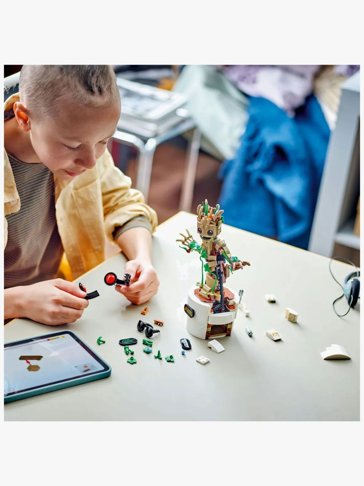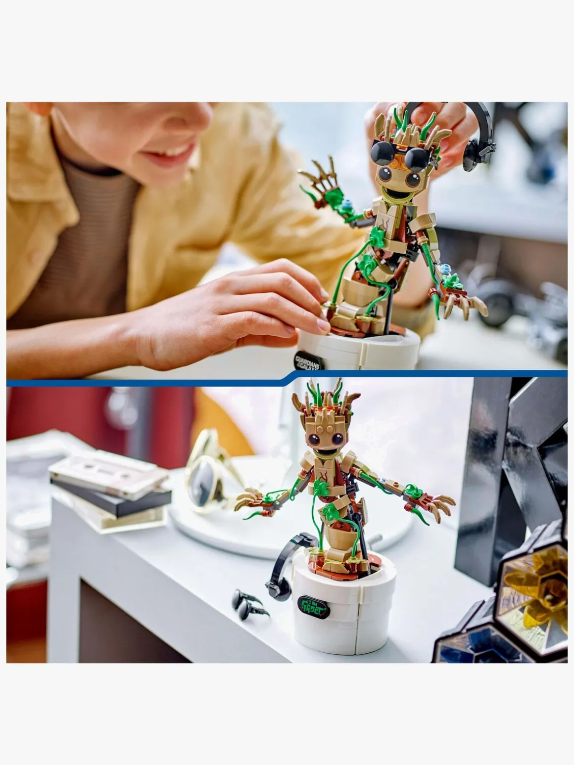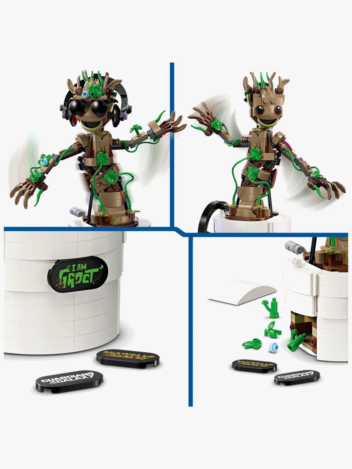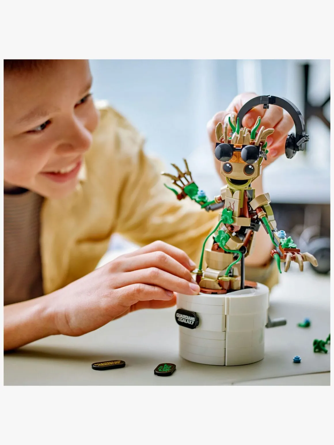 Byggelegetøjet af Groot til børn har bevægeligt hoved og poserbare arme. Når børn drejer håndtaget bag på blomsterkrukken, begynder den leddelte Groot at danse. Figuren kan tilpasses med ekstra blade, hovedtelefoner og solbriller, der kan bygges, og børn kan give Groots urtepotte et personligt præg ved at tilføje 1 ud af 3 forskellige navneplader foran bl.a. en med reference til tv-serienI Am Groot. Alt tilbehøret kan opbevares i et indbygget rum i potten. For at gøre det endnu sjovere at bygge modellen kan børn bruge LEGO Builder appen til at zoome ind på og dreje modeller i 3D samt holde styr på, hvor langt de er kommet i byggeprocessen.