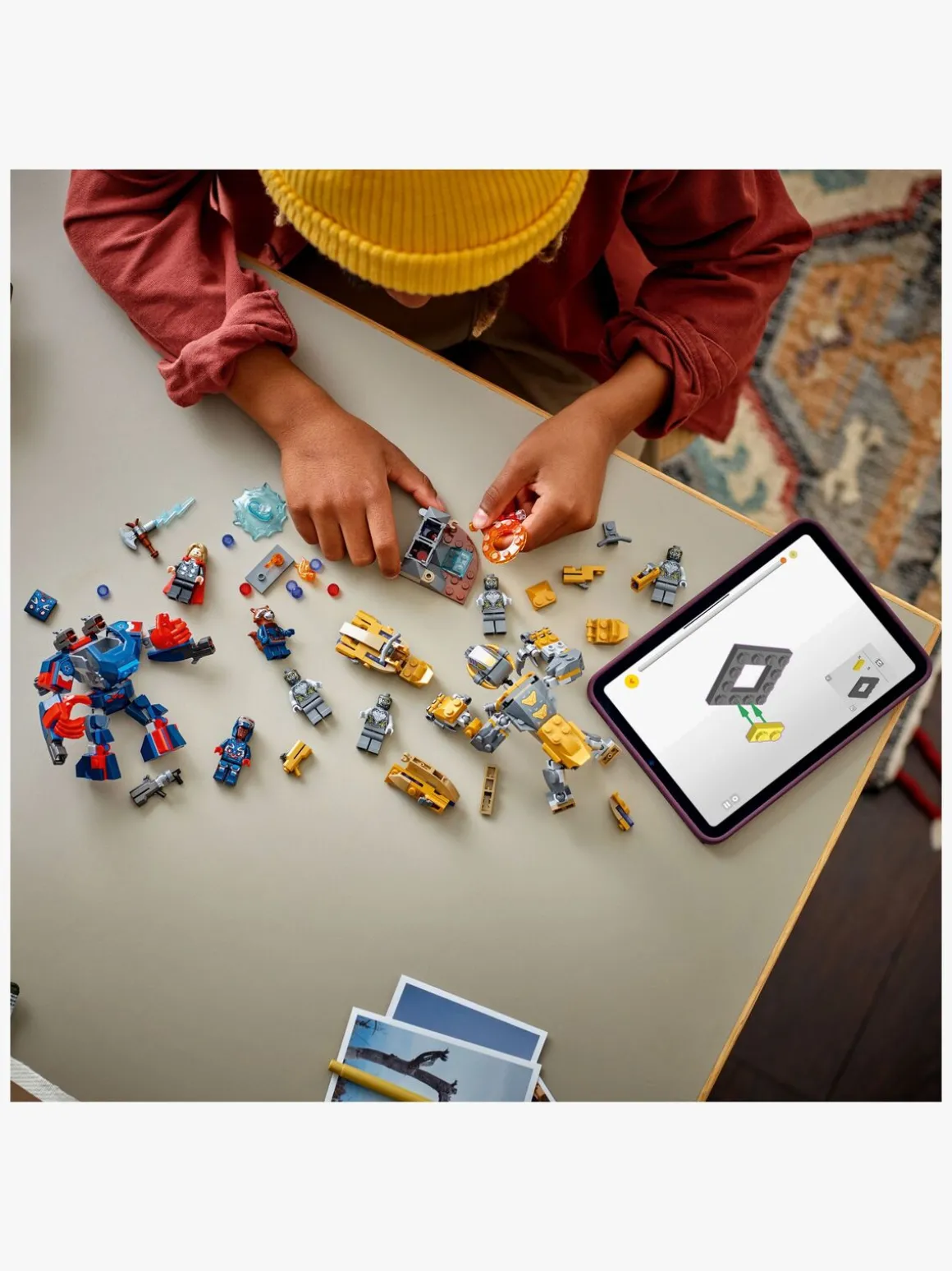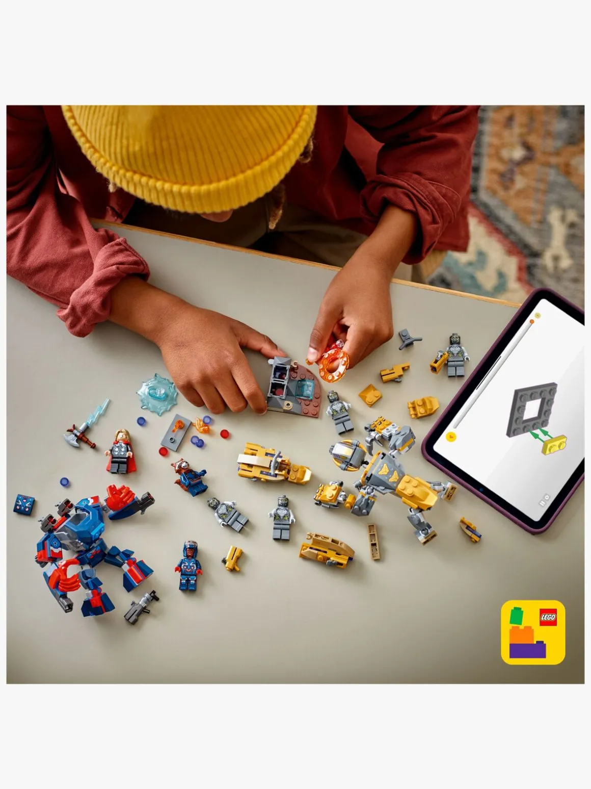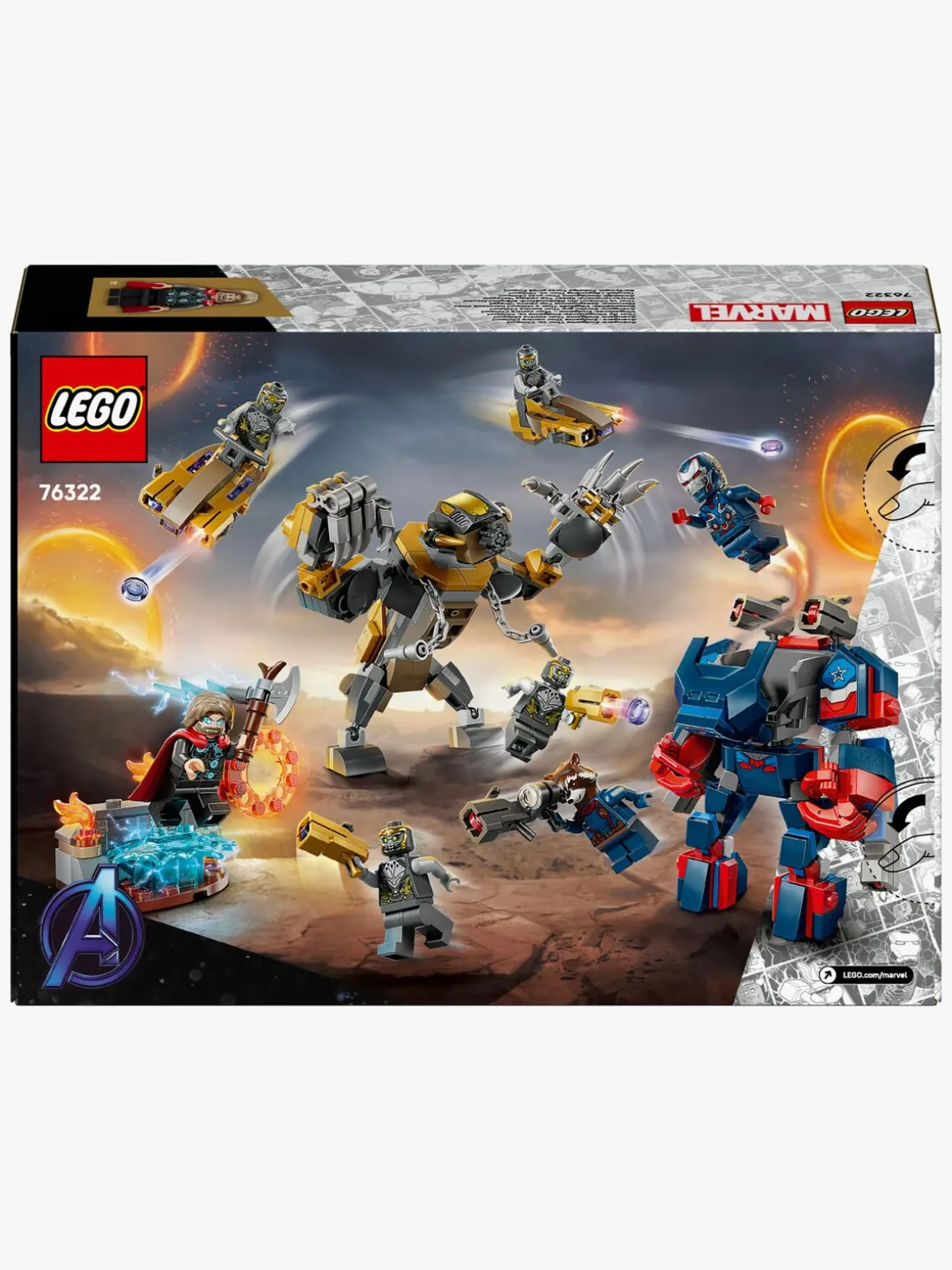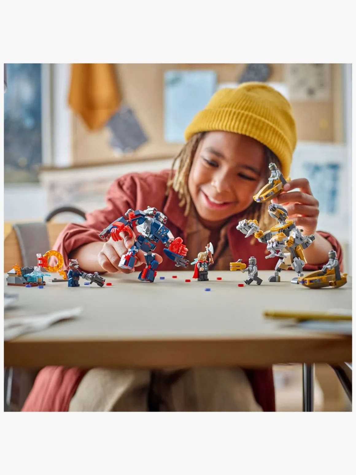Byg-selv-sættet med superheltetema er baseret på en ikonisk kampscene fra Marvels Avengers-film og indeholder 2 store LEGO figurer: en Iron Patriot-mech, der har 4 knopskydere, og en frygtindgydende chitauri-gorilla. Begge er leddelte for at sikre dynamisk leg. Der er 7 minifigurer: Iron Patriot MK2, Rocket med en stor knopskyder, Thor med Stormbreaker, 4 chitaurier, hvoraf 2 har gyldne knopskydere. Omfatter også 2 jetscootere og et lille miljø til Thor med plads til ekstra skydeknopper. Bygge- og legesættet kan kombineres med Avengers: Endgame – den endelige kamp 76323 for at udvide legeoplevelsen. Byggere kan også zoome ind på og dreje modeller i 3D i den sjove, intuitive LEGO Builder app. Indeholder 373 elementer.