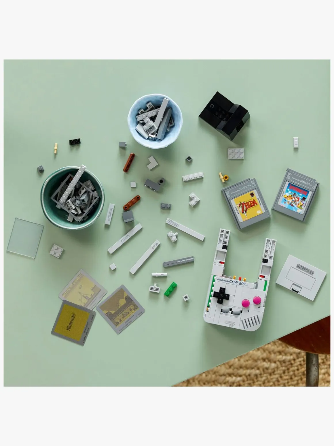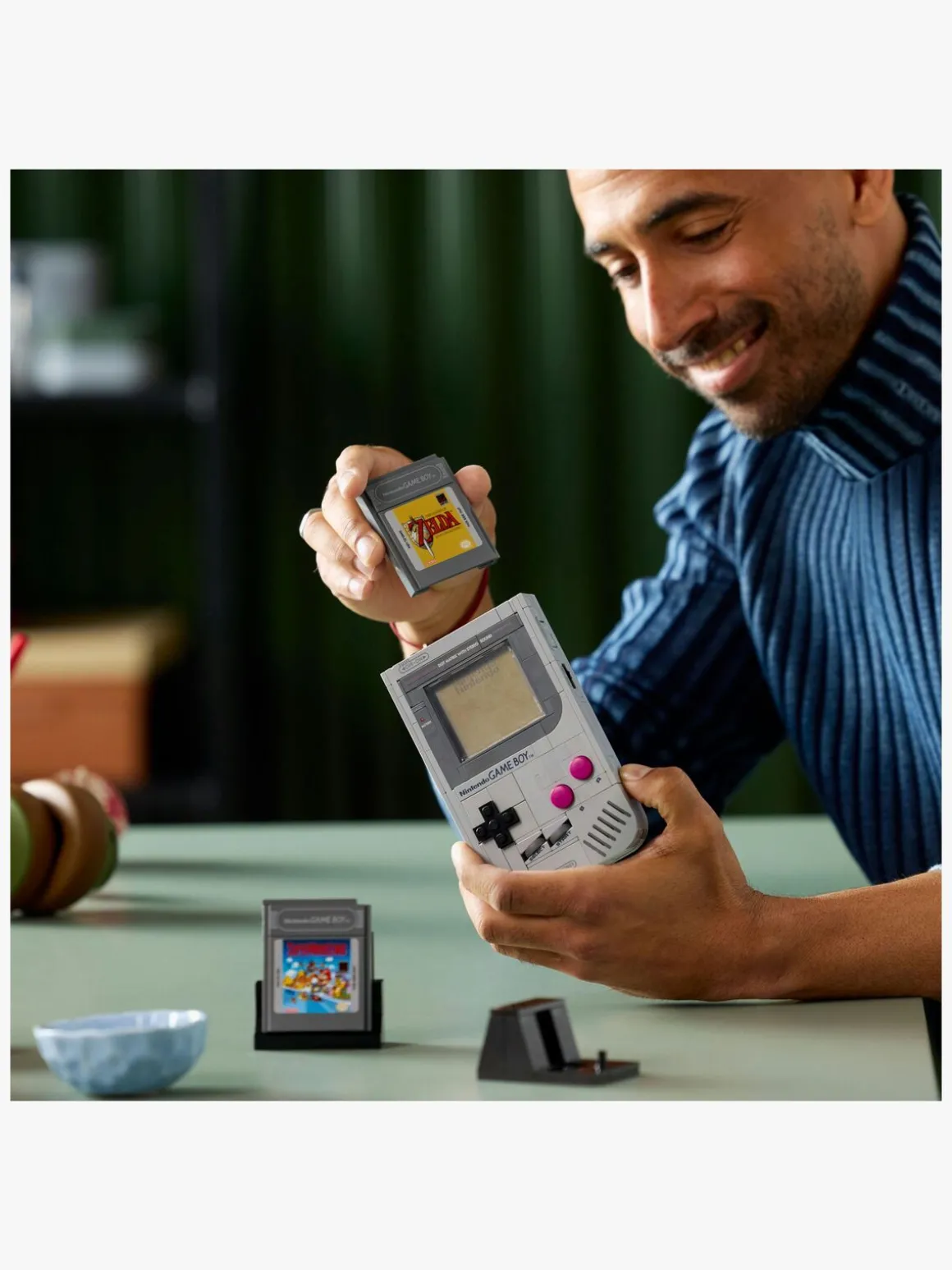 Tilpas din udstilling med udskiftelige, klodsbyggede Game Paks og tilhørende holografiske skærme: The Legend of Zelda: Link’s Awakening og Super Mario Land eller en Nintendo-startskærm. Anbring din kreation på udstillingsstanden, der kan bygges, for at fuldende en nostalgisk udstilling.