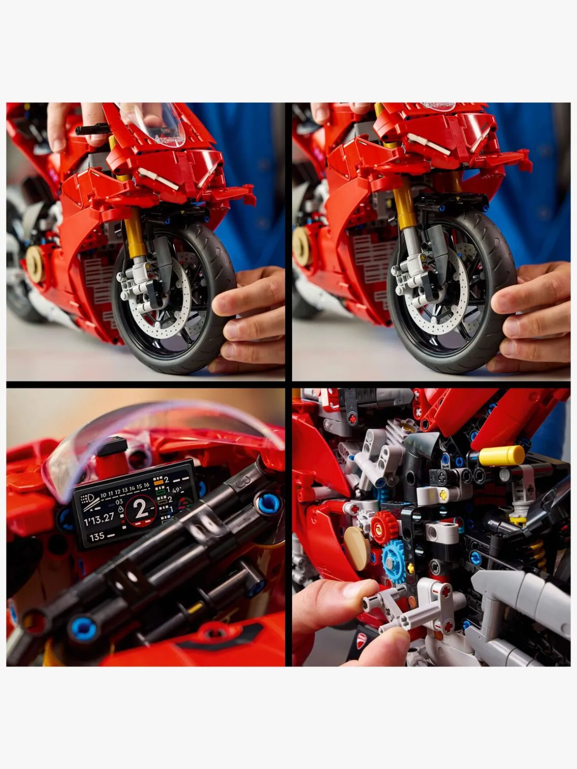 Udforsk for- og baghjulsaffjedringen og styret. Tjek pedalgearskiftet med 3-trins samt frigear gearkasse. Brug baghjulet til at drive kæden, som er forbundet med gearkassen og V4-motoren. Med sin ikoniske røde Ducati-farve er denne model af en motorcykel en fantastisk gaveidé til motorcykelfans. Den omfatter en stand, som gør den til en iøjnefaldende udstillingsgenstand.
