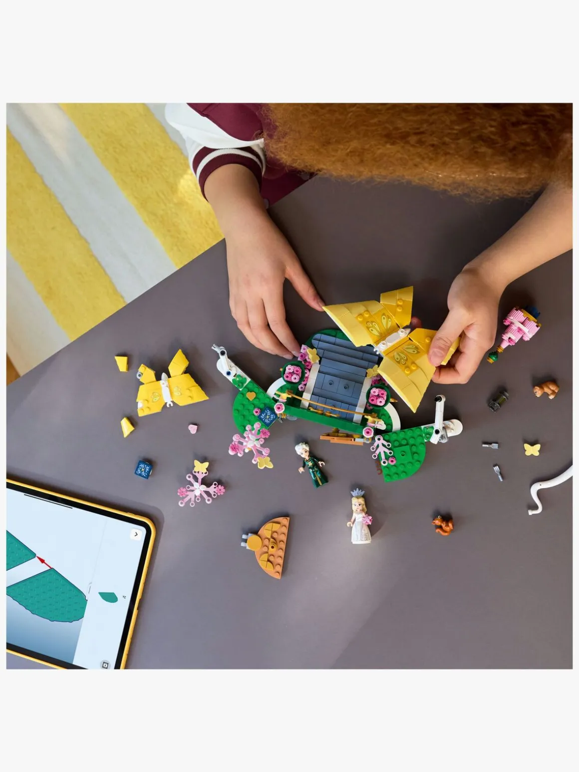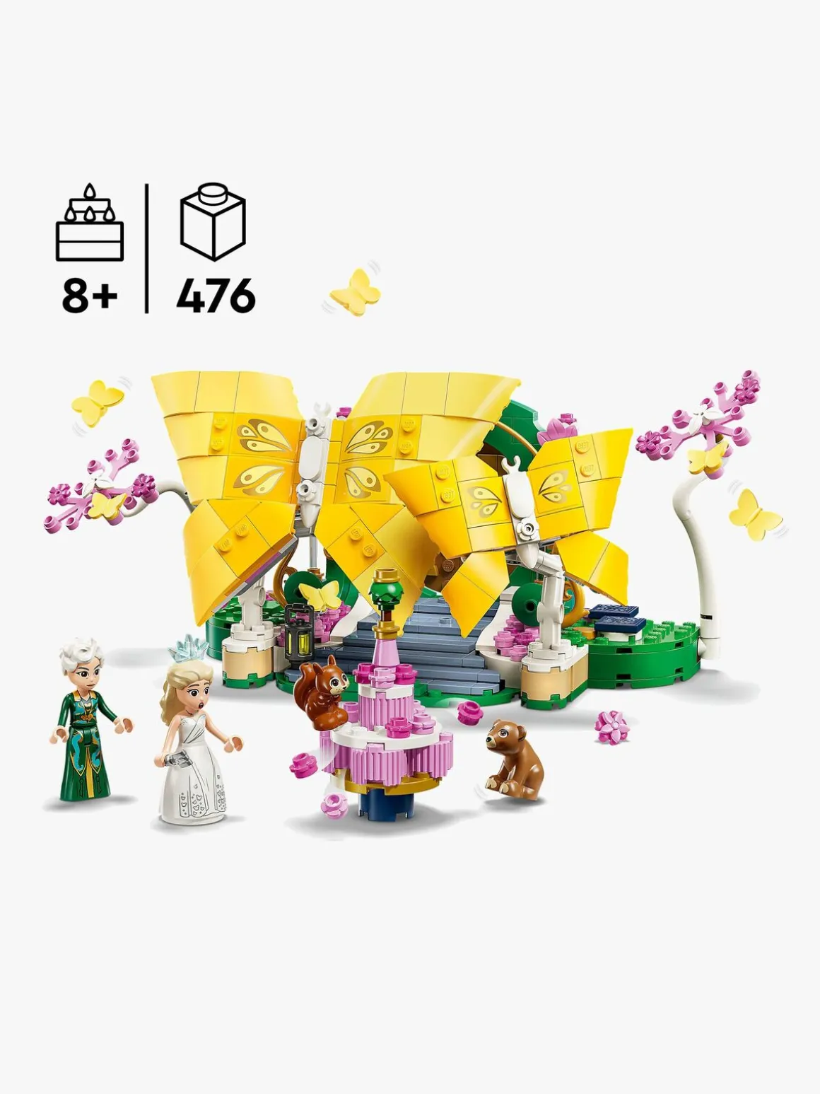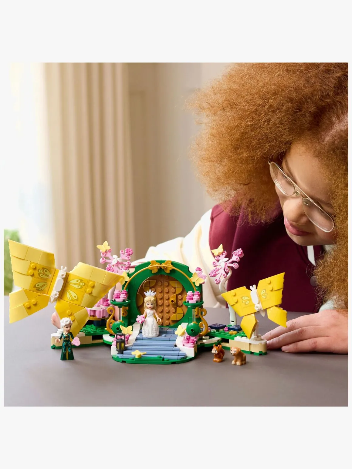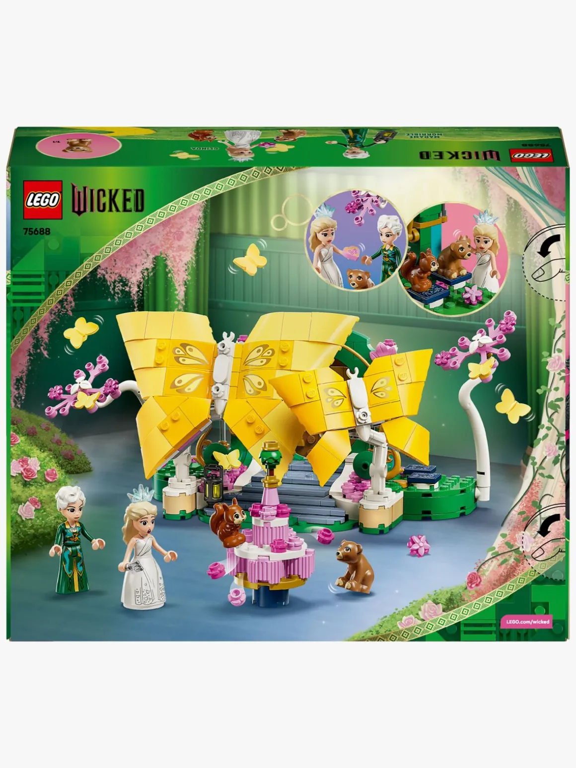 Børn kan adskille de store bevægelige sommerfugle på LEGO byggesættet for at afsløre bryllupsscenen. Den fantasifulde gave er fyldt med genkendelige detaljer fra filmen, bl.a. bryllupskagen, en hjerteformet invitation og Glindas buket fra Fiyero. Som inspiration til autentisk rolleleg bærer Glinda sin kjole og tiara fra filmen og har et ansigt, der kan ændre udtryk, når hendes dag går fra glædelig til katastrofal, og de medfølgende dyrefigurer stormer gennem scenen.