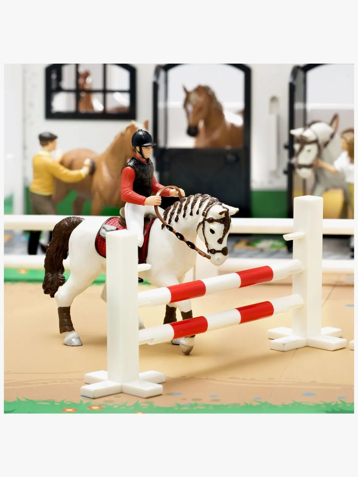 Inde i stalden er der tre båse, som alle kan åbnes og lukkes. Pakken indeholder også to forhindringer til hestefolden og ti stk. hegn.