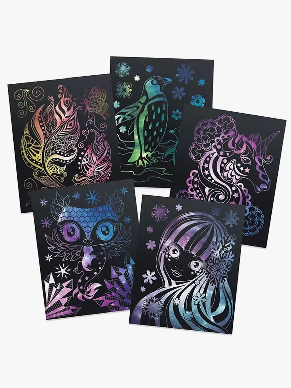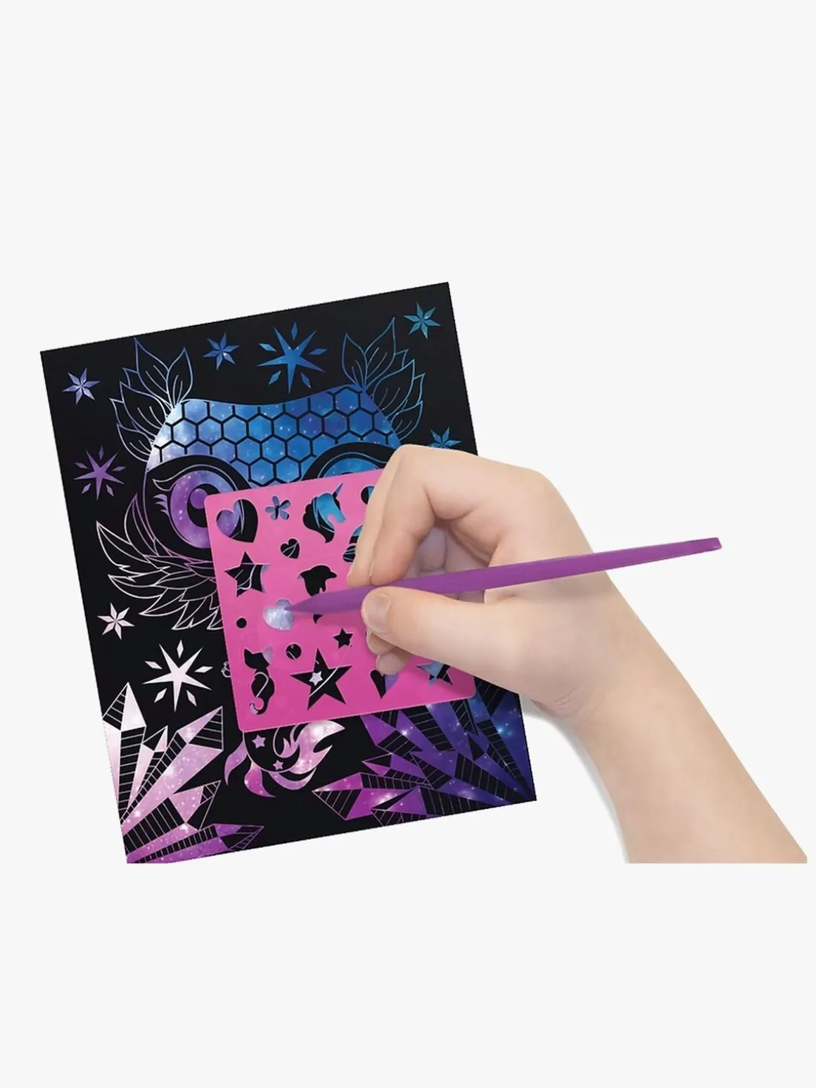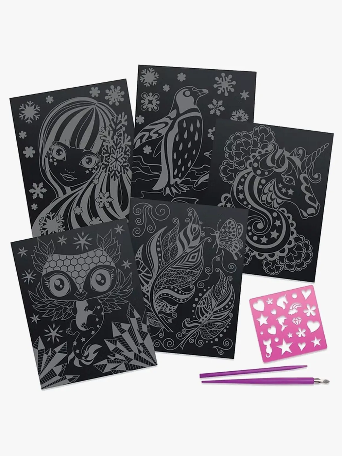 – Indeholder: 5 skrabeplader med galakse-effekt, 2 skrabeværktøjer, 21 stenciler, 1 instruktionsbog.
