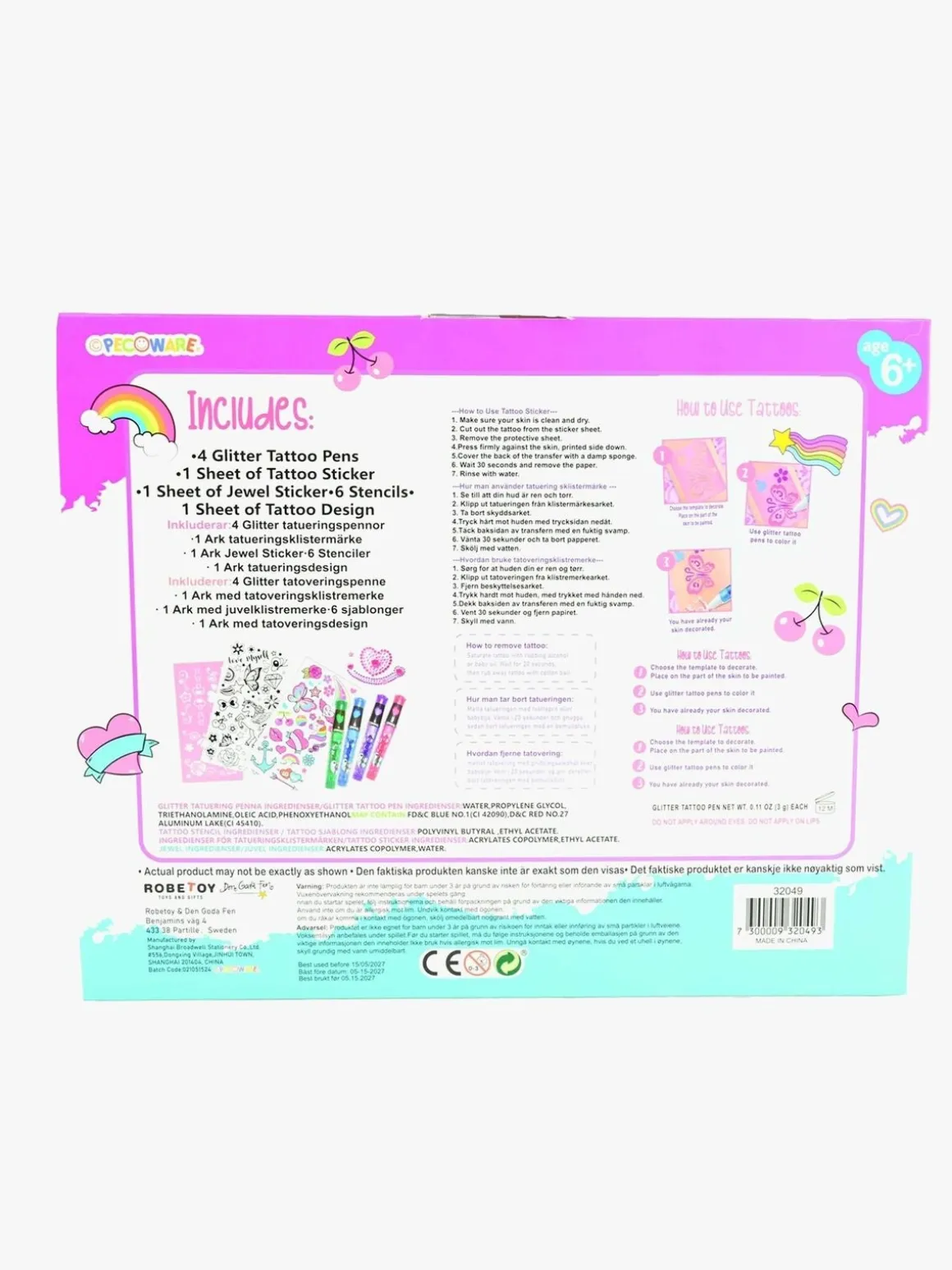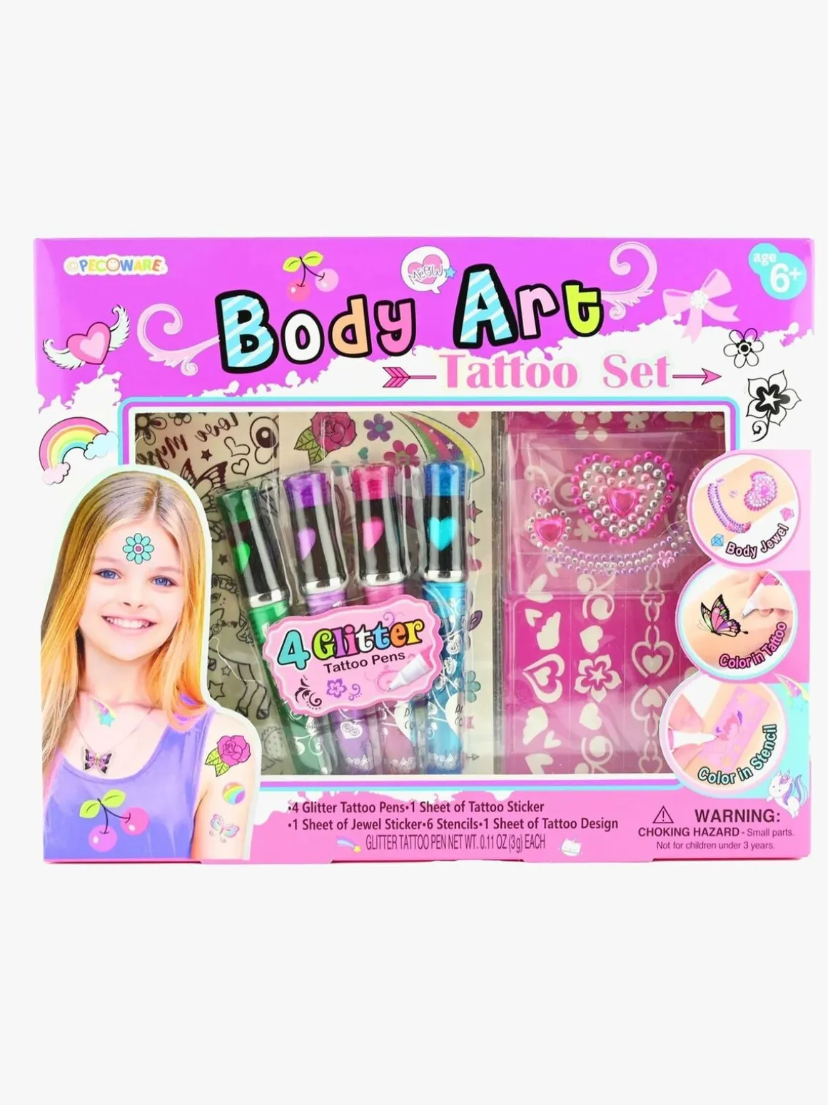 – Indeholder: 4 glitter-tatoveringspenne, 1 tatoveringsklistermærkeark, 1 juvelklistermærkeark, 6 stenciler, 1 tatoveringsdesignark.