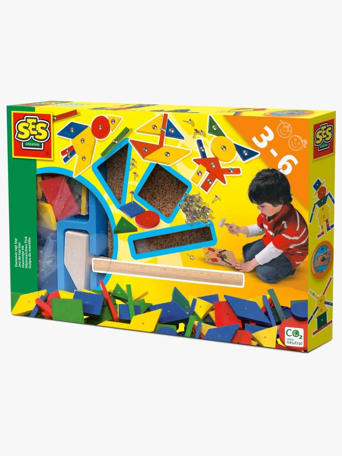 – Brug hammeren til at hamre de farverige træstykker fast på korktavlen og skab sjove og kreative mønstre.
