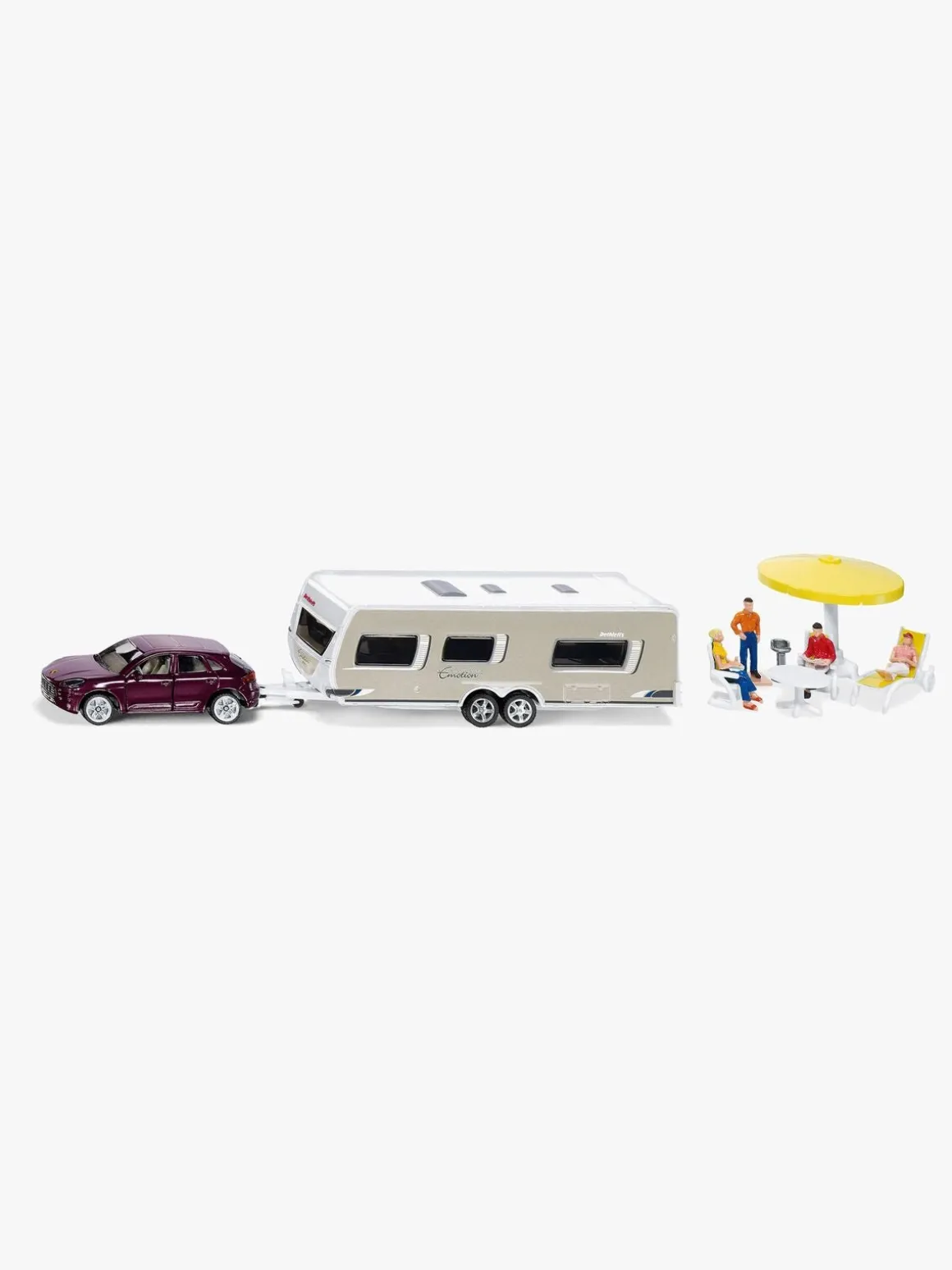Taget på campingvognen og bilens fordøre kan åbnes. Parasol, stole, rejsende og grill følger med.