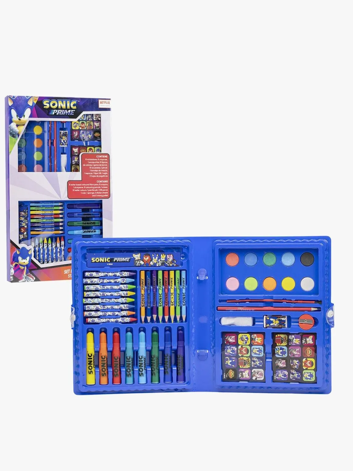 – Indeholder: 8 filttusser, 8 farvekridt, 8 farveblyanter, 2 blyanter, 1 viskelæder, 1 blyantspidser, 1 lineal, 2 klistermærkeark, 12 vandfarver, 1 pensel.