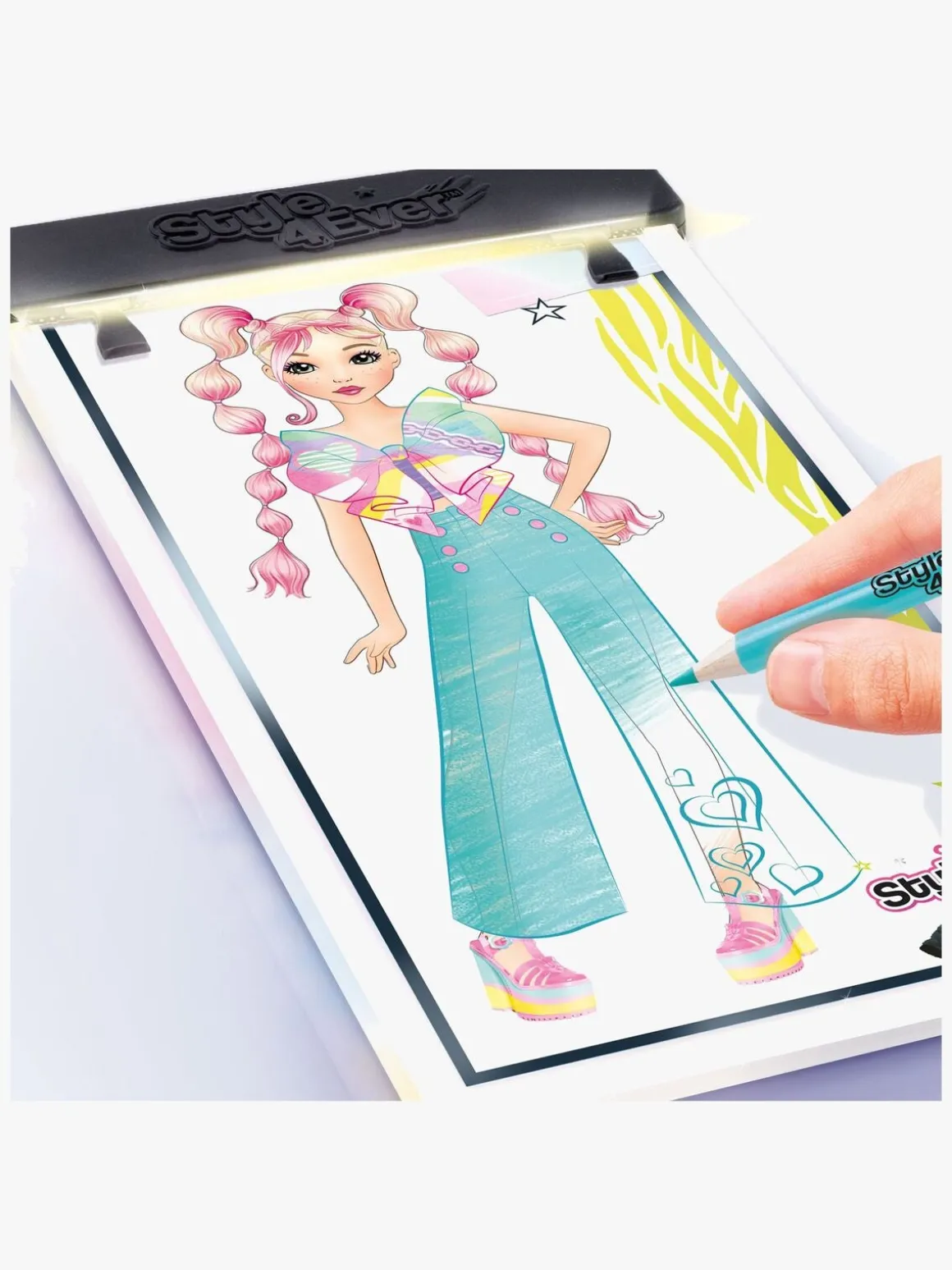 – Indeholder: 1 Light-up Pad, 6 ark med klistermærker, 6 farveblyanter, 10 stenciler, 1 oplader.