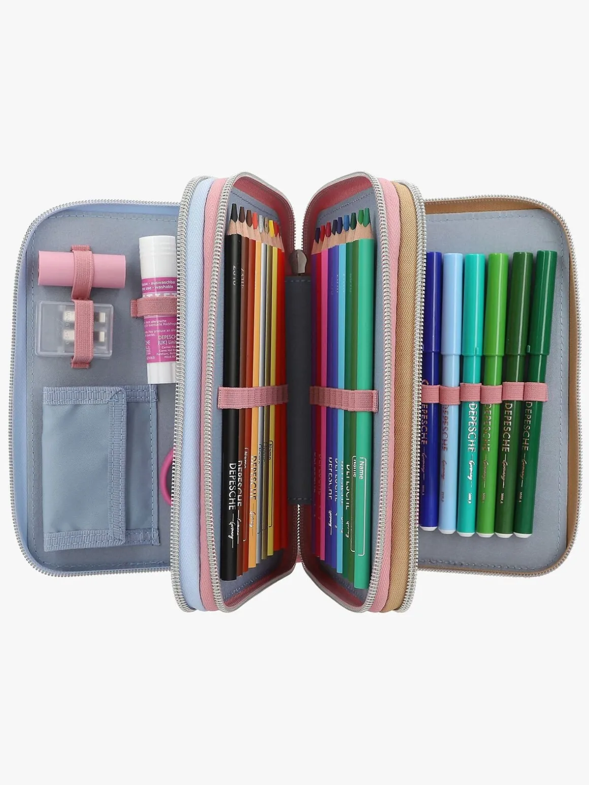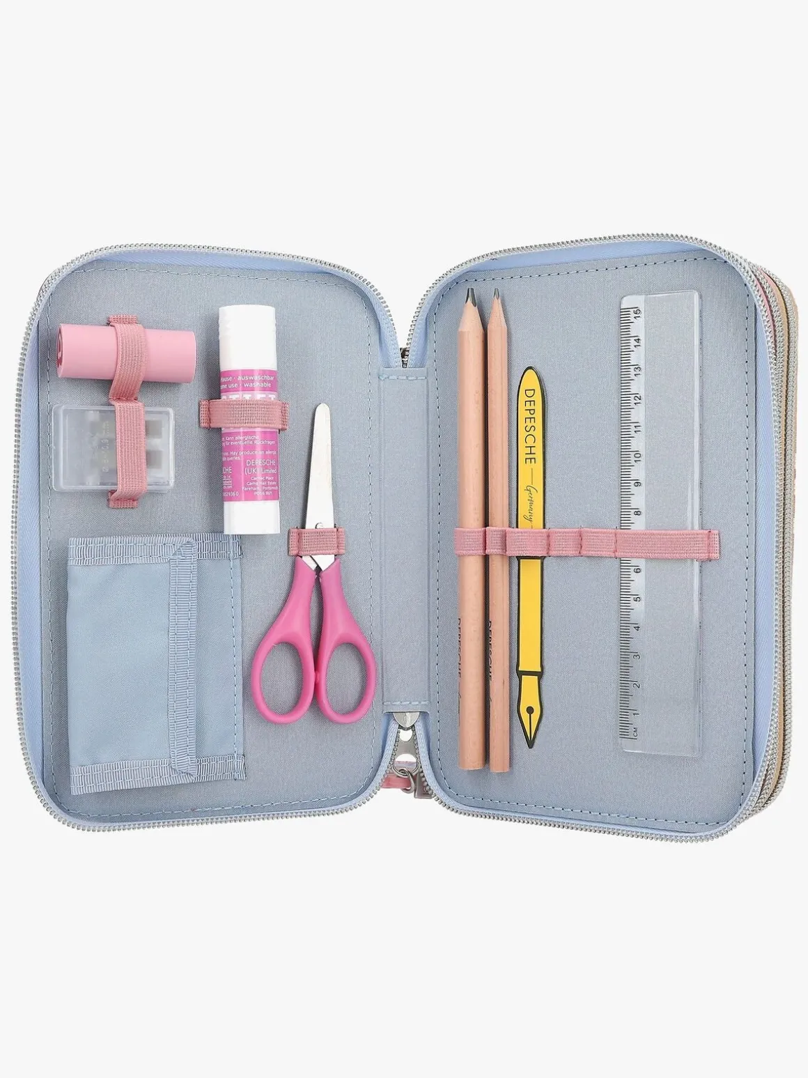 – Indeholder: 1 penalhus, 18 farveblyanter, 18 tusser, 2 blyanter, 1 saks, 1 limstift, 1 blyantspidser, 1 lineal, 1 viskelæder.