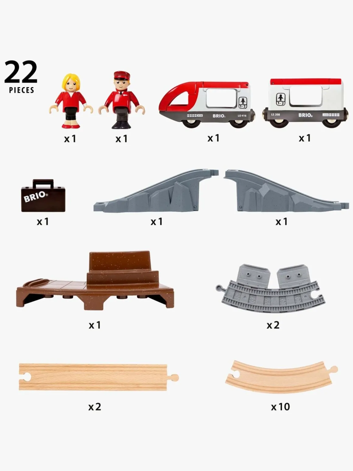 – Indeholder: 1 tog, 1 anhænger, 2 figurer, 2 broer, 1 perron, 2 montageskinner, 2 lige skinner, 10 bøjede skinner, 1 kuffert.