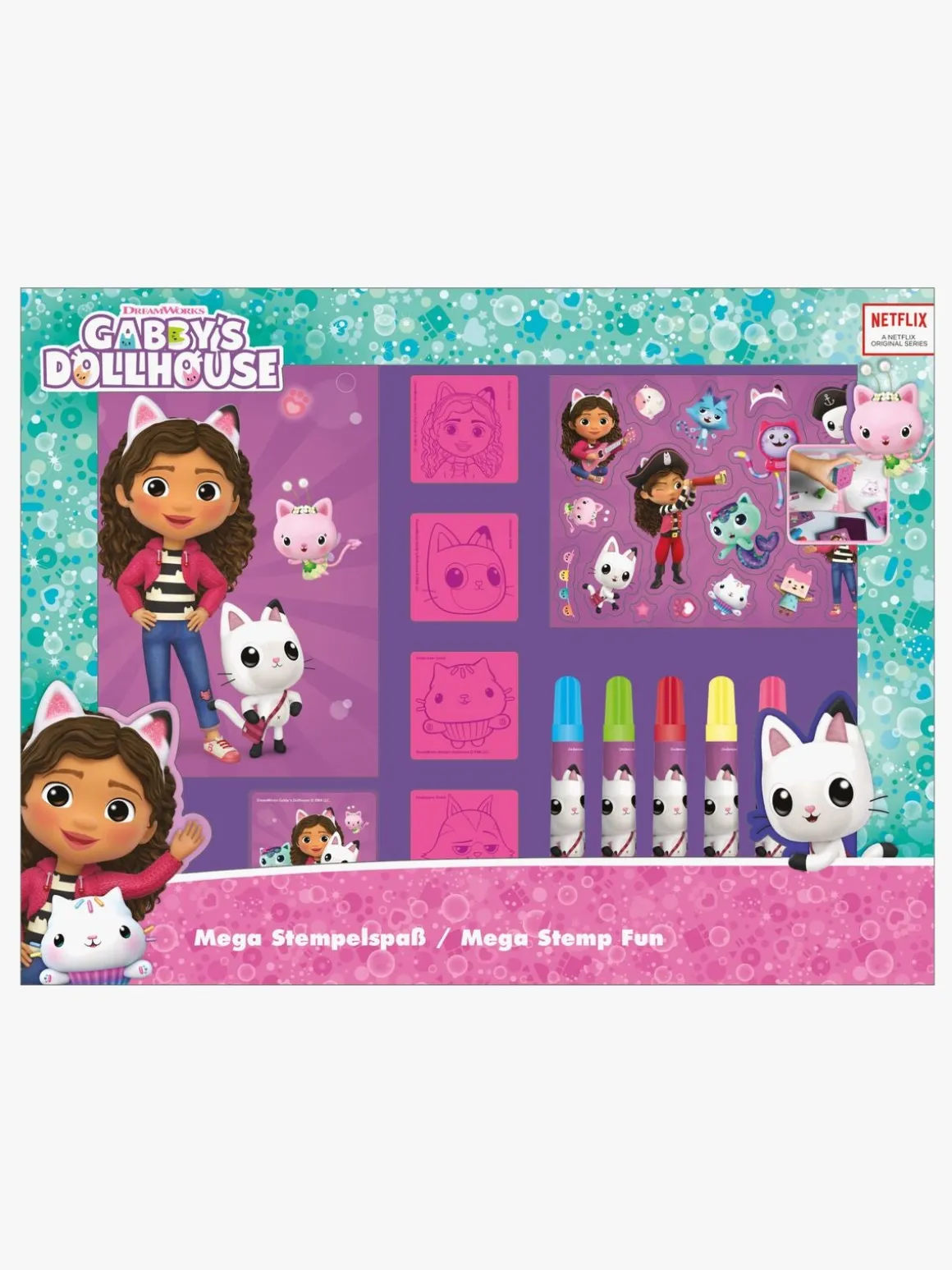 – Indeholder: 4 stempler, 1 blækpude, 1 klistermærkeark, 1 malebog, 5 farveblyanter.