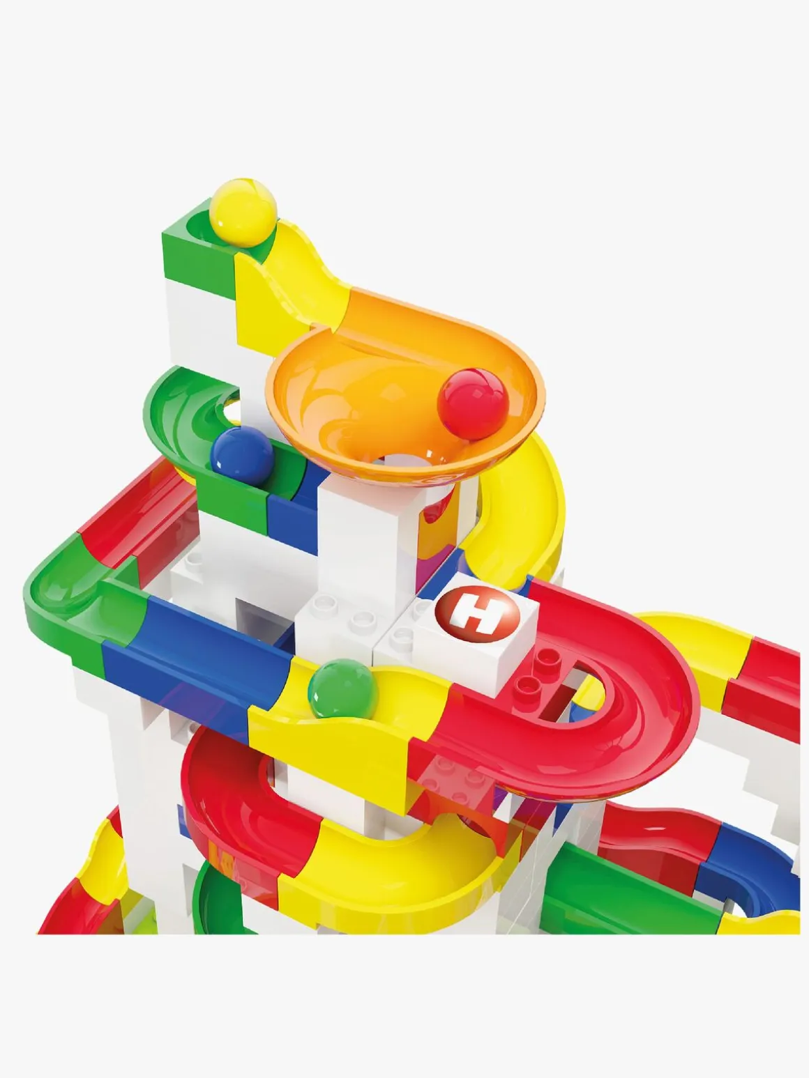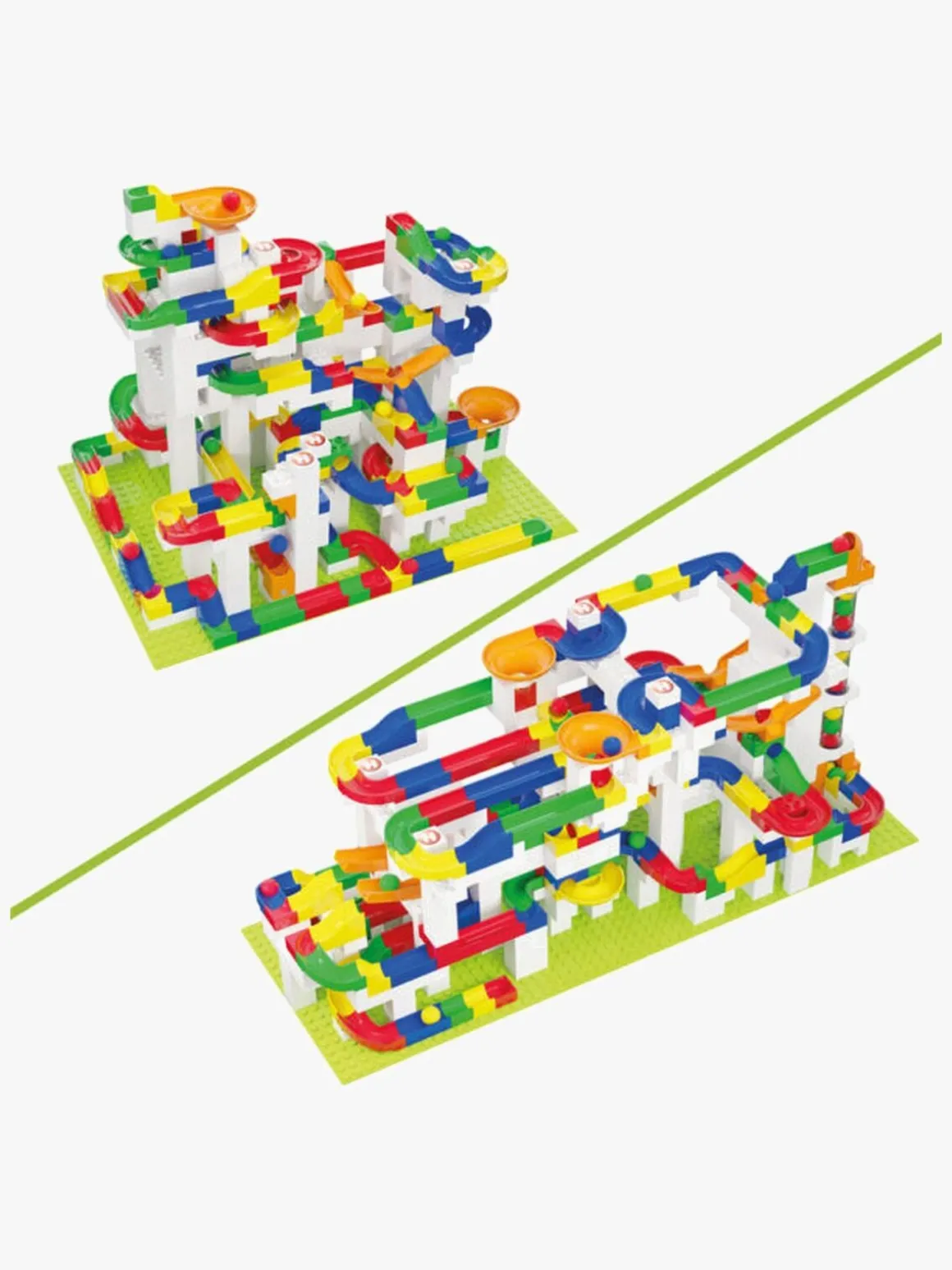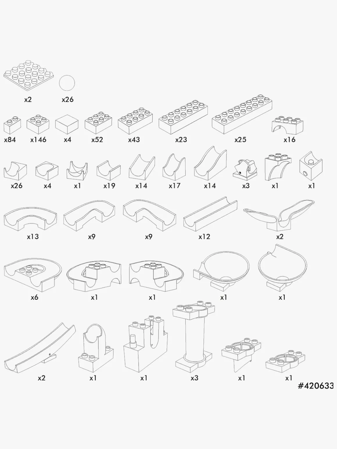 – Indeholder: 162 baneelementer, 377 byggeklodser, 20 konstruktionselementer, 26 kugler, 1 instruktionsbog.