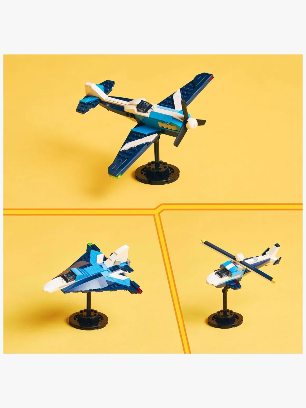 Børn kan vælge at bygge 3 forskellige fantastiske fartøjer: et legetøjsfly med drejelig propel og bevægelige hjul; et legetøjsjetfly med bevægelige hjul og en helikoptermodel med drejeligt rotorblad. Hver model kan udstilles på en klodsbygget stand, og sættet er en imponerende gave til børn, der kan lide at udspille fantasifulde, actionfyldte historier.