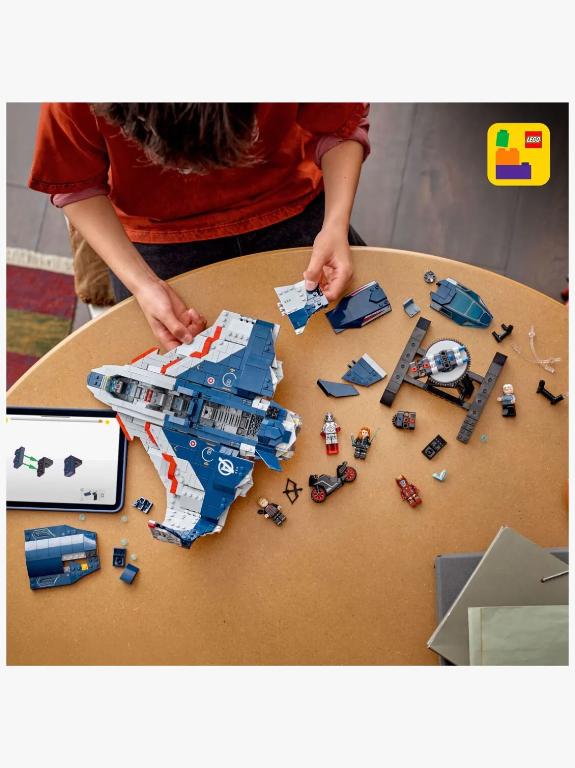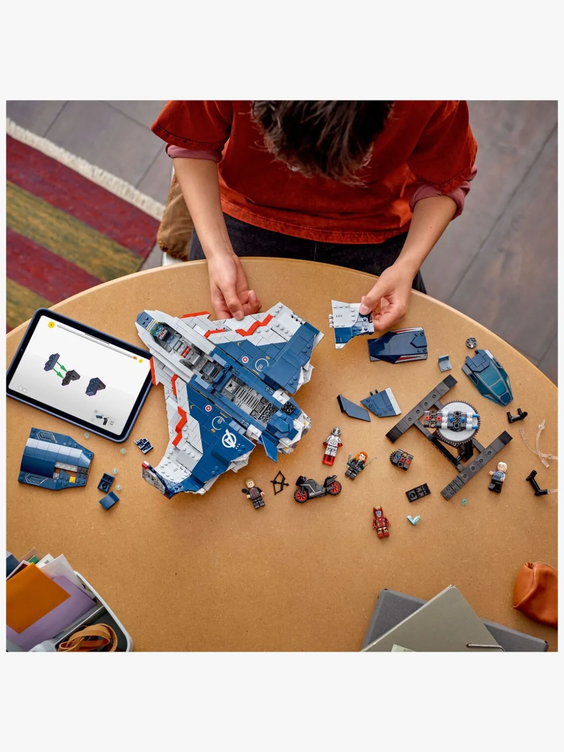 Byggemodellen af en quinjet omfatter 5 minifigurer: Black Widow med sin motorcykel, Iron Man, Quicksilver, Ultimate Ultron og Hawkeye med sin bue og pil. Minifigurerne kan fastgøres flere steder på flyet. Quinjetten har cockpit, der kan åbnes, 2 knopskydere foran og opbevaring til Black Widows våben og Hawkeyes bue. Baglugen kan åbnes, så børn kan køre motorcyklen ind og ud. Der medfølger også en aftagelig, drejelig stand, der giver en 360-graders visning af det ikoniske fly. For at få endnu mere digitalt sjov kan byggere zoome ind på og dreje modeller i 3D og holde styr på, hvor langt de er kommet, med den sjove, intuitive LEGO Builder app. Indeholder 1.131 elementer.