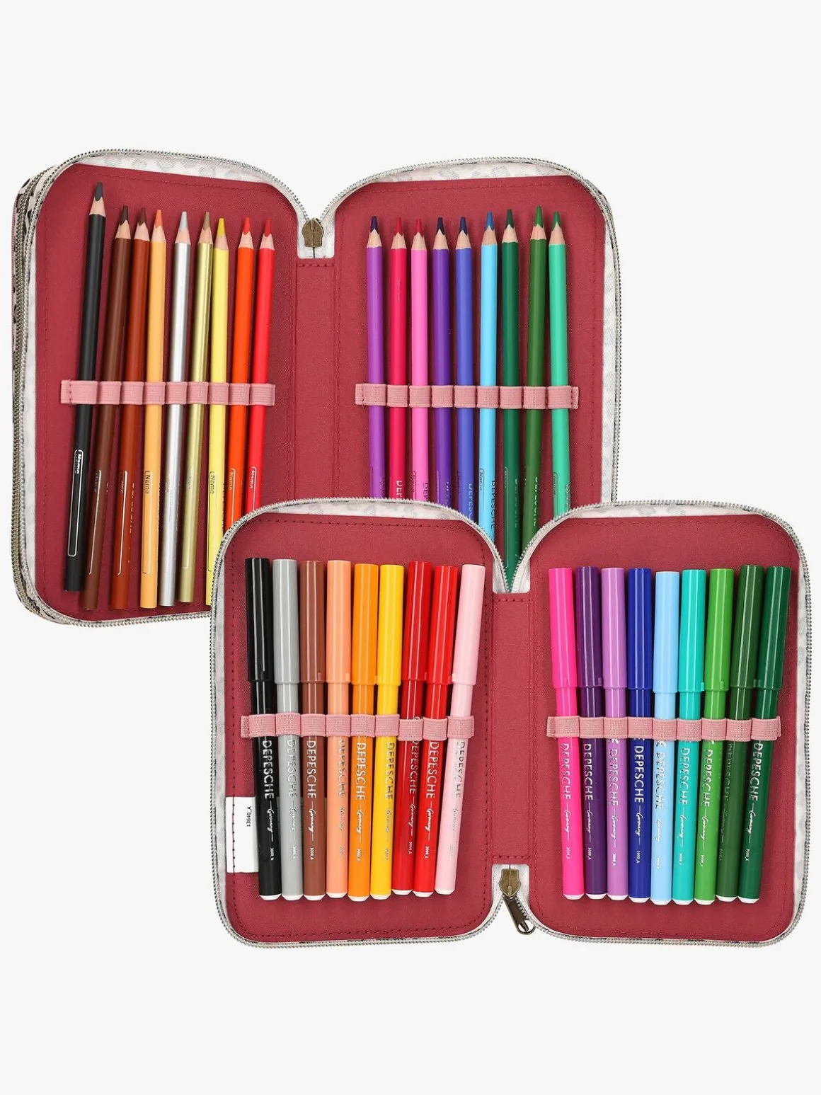 – Indeholder: 1 penalhus, 18 farveblyanter, 18 tusser, 2 blyanter, 1 saks, 1 limstift, 1 blyantspidser, 1 lineal, 1 viskelæder.