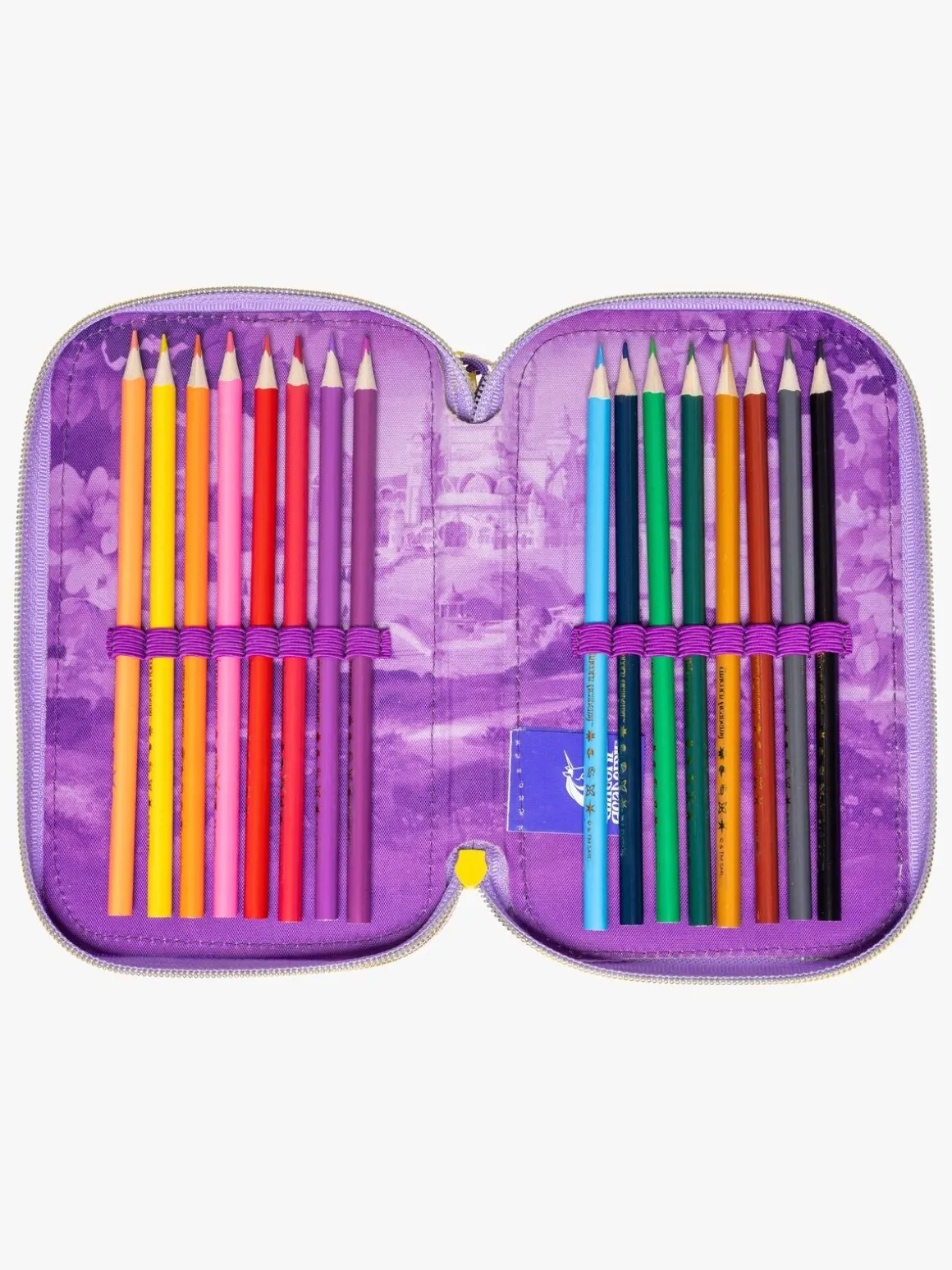 – Indeholder: 1 penalhus, 16 farveblyanter, 1 notesblok, 1 viskelæder, 1 blyantspidser, 1 lineal, 2 blyanter.